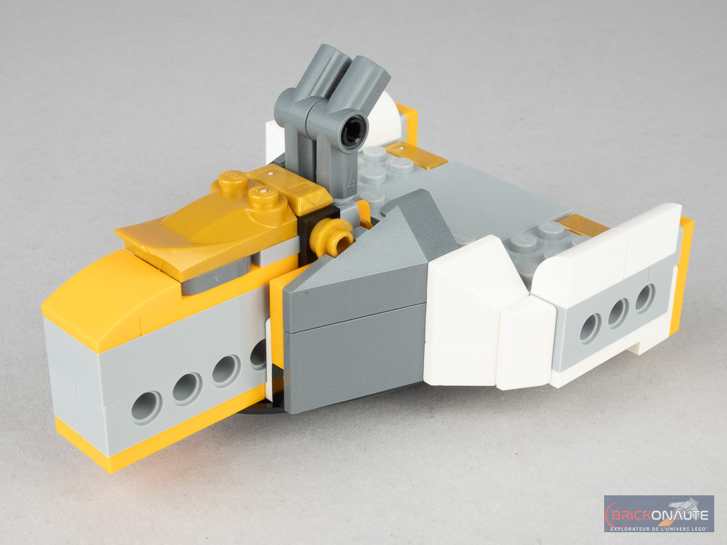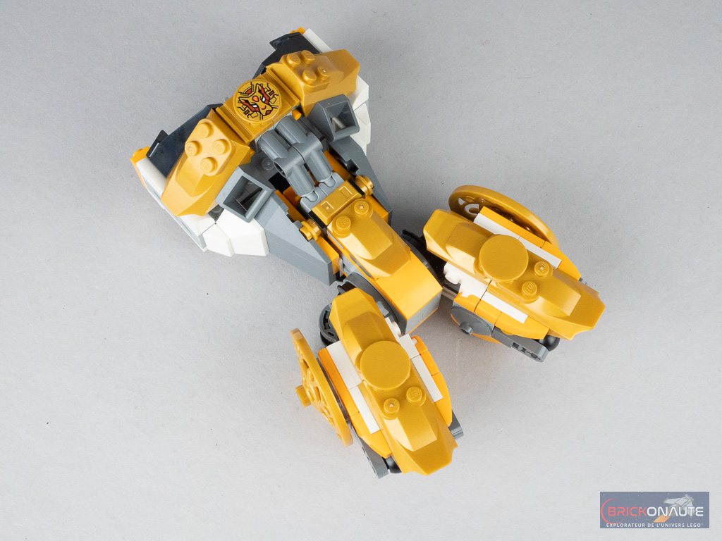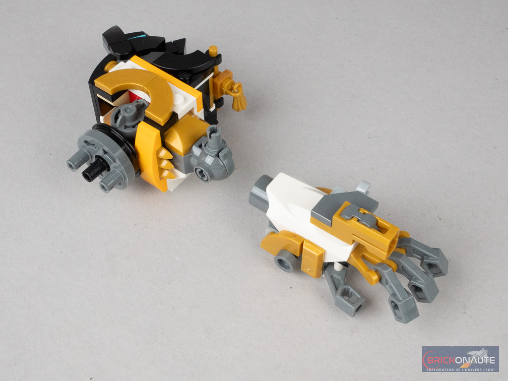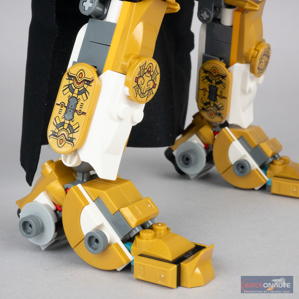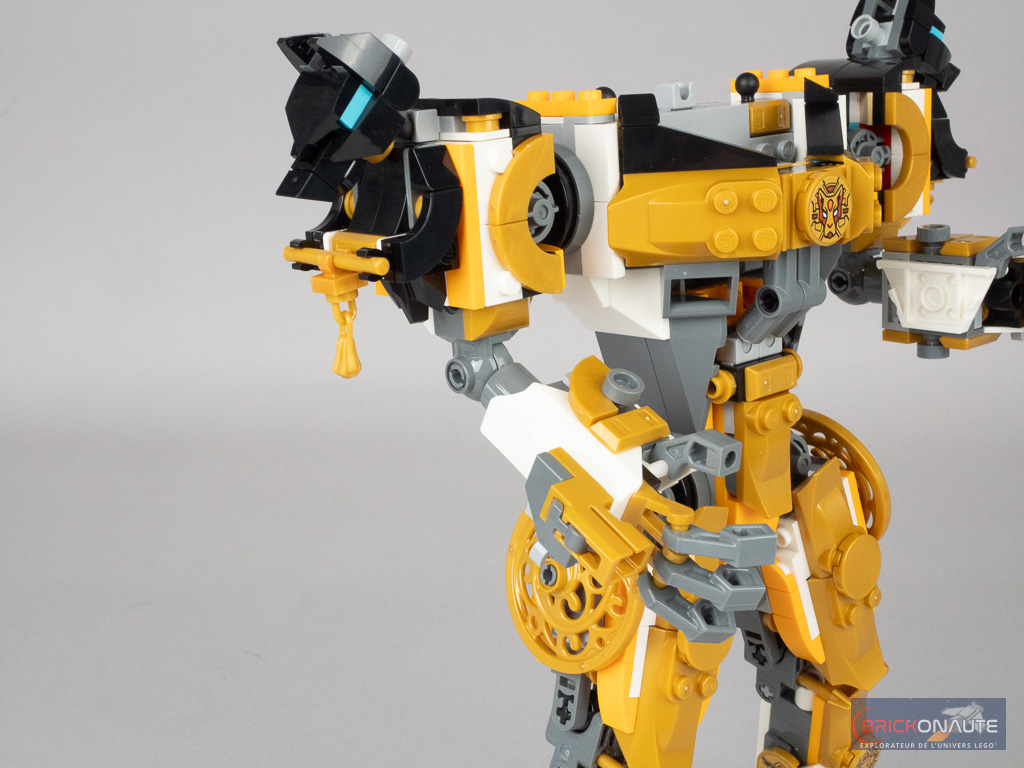 Ces articulations sont une nouvelle fois un peu trop visibles à mon goût, même si le schéma de couleurs retenu pour le robot, mélange de doré, blanc et dark bluish gray, permet de mieux les intégrer à l’ensemble.