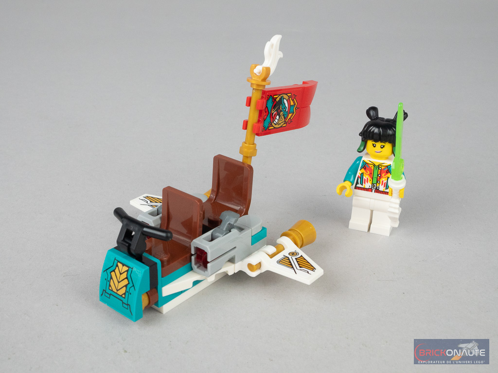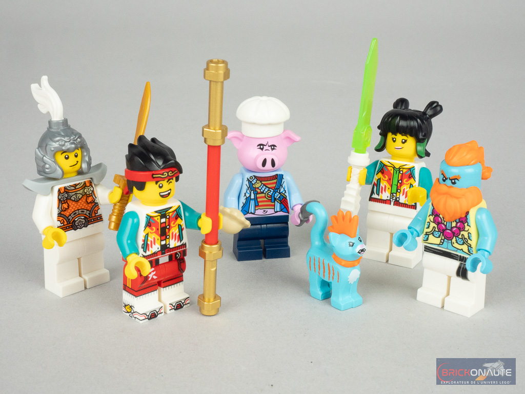 Sans compter que la dotation en minifigs est également très intéressante avec un total de 5 personnages (Monkie Kid, Mei, Sandy, Pigsy et un guerrier céleste) et le chat Mo. Pour tous ces personnages, c’est bien simple : tous les torses sont nouveaux, à l’exception de celui de Pigsy introduit en 2024 dans la gamme. Il n’y a rien à redire sur la réalisation, c’est très propre et extrêmement détaillé. Le casque du guerrier céleste est un nouvel élément pour 2025, mention spéciale en ce qui le concerne pour sa tenue traditionnelle absolument sublime – dommage que le pantalon soit monochrome.