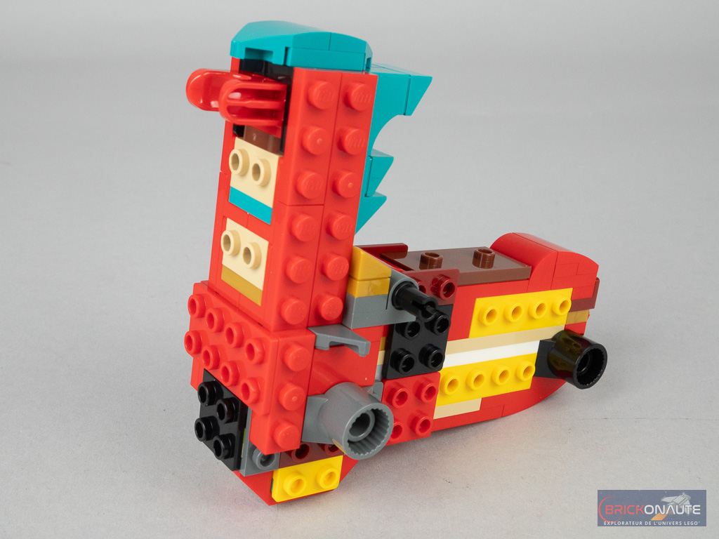 Sur ce même sujet, j’aurais aimé que LEGO intègre une articulation au niveau des genoux, ce qui nous aurait permis de lui donner des poses plus dynamiques. En l’état, pour lui trouver un équilibre avec une patte levée, j’ai dû m’aider des briques transparentes que vous voyez sur les photos. Sans cet artifice, on devra veiller à garder les pattes parallèles pour le faire tenir debout.