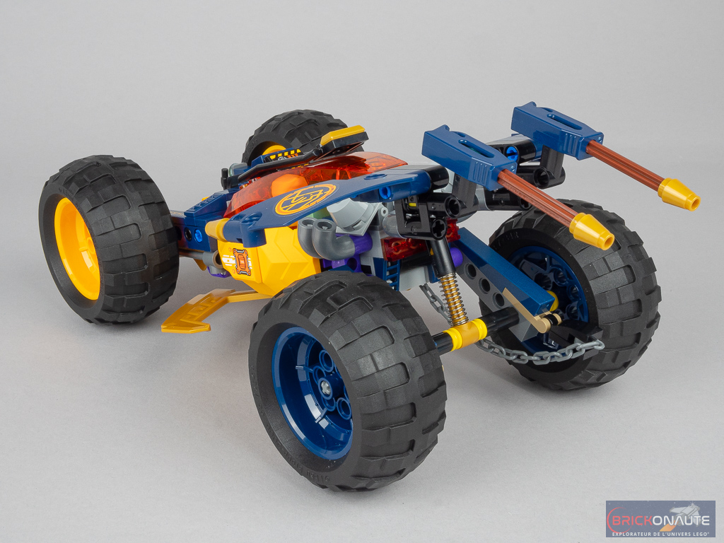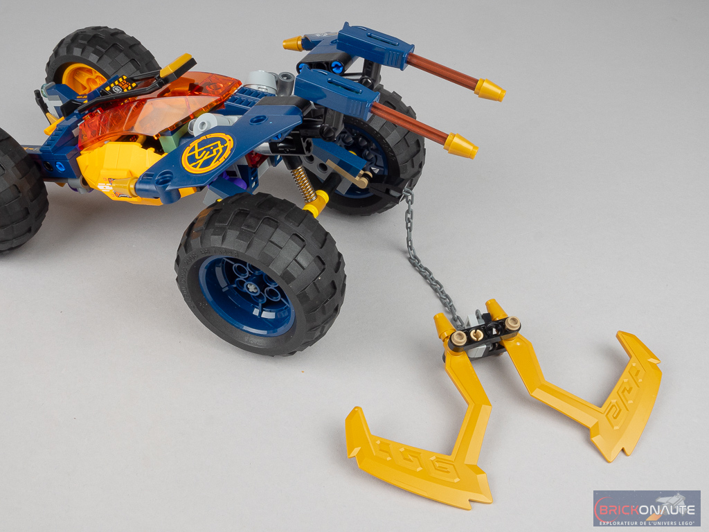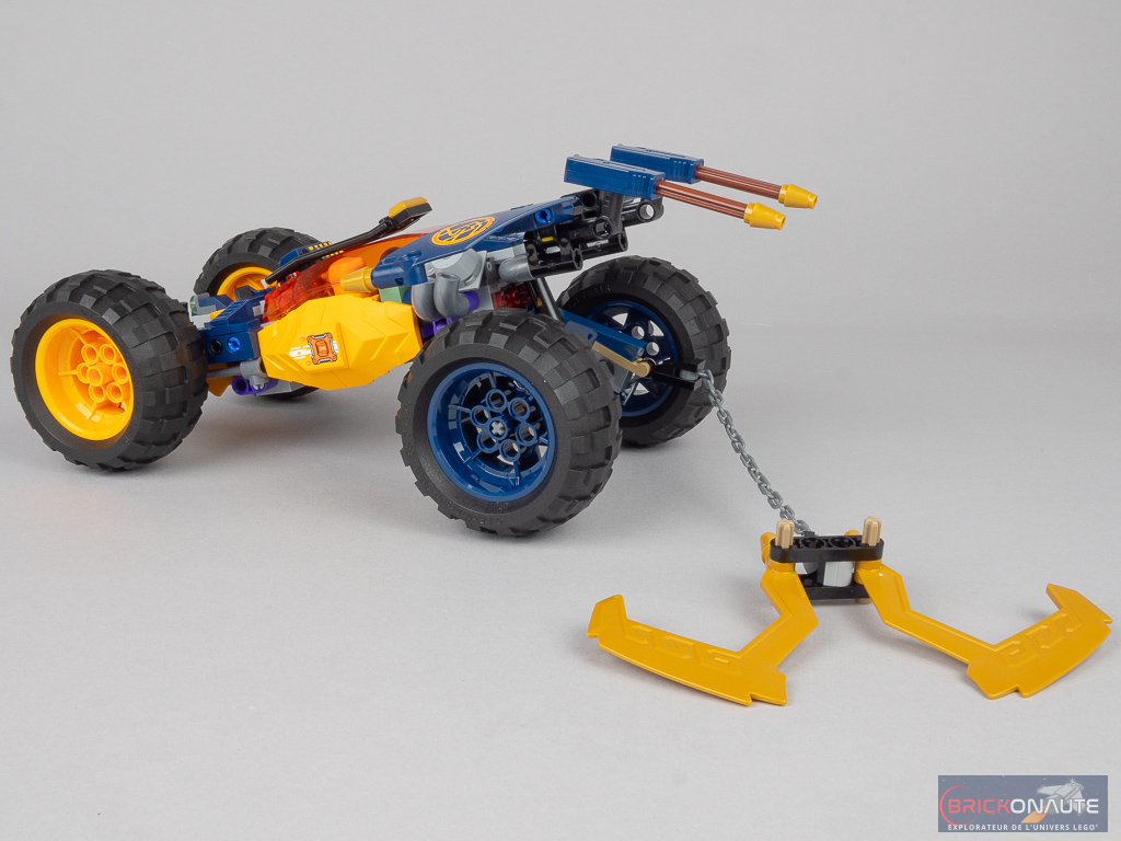 En plus d’être sympa pour son design, ce buggy l’est également pour sa jouabilité. Plusieurs choses à noter au delà du fait qu’il s’agisse d’une voiture et donc… qu’elle roule, tout simplement. La suspension arrière est fonctionnelle avec un amortisseur central et un petit assemblage d’éléments Technic, deux stud shooters nouvelle génération sont installés sur les ailes arrières (il renferment chacun 3 munitions à éjecter en poussant sur l’axe) et une chaîne avec deux grosses lames peut être traînée derrière l’engin. Il est également possible de fixer ce sous-ensemble en dessous du buggy, c’est bien pensé.