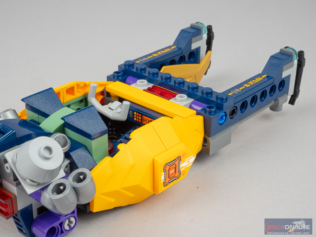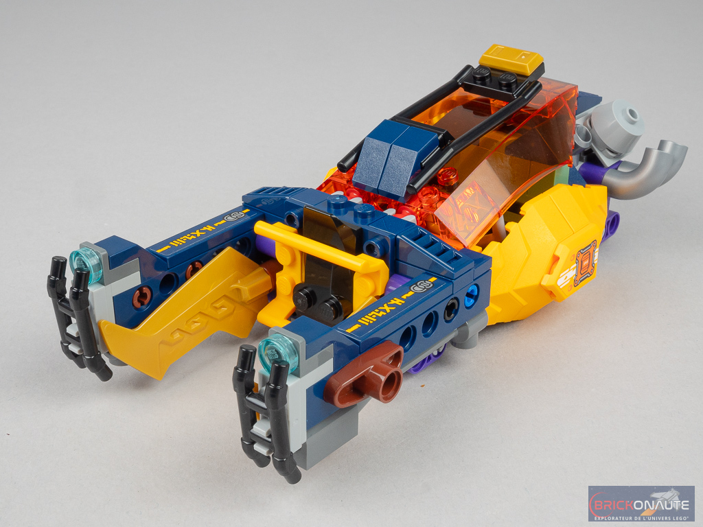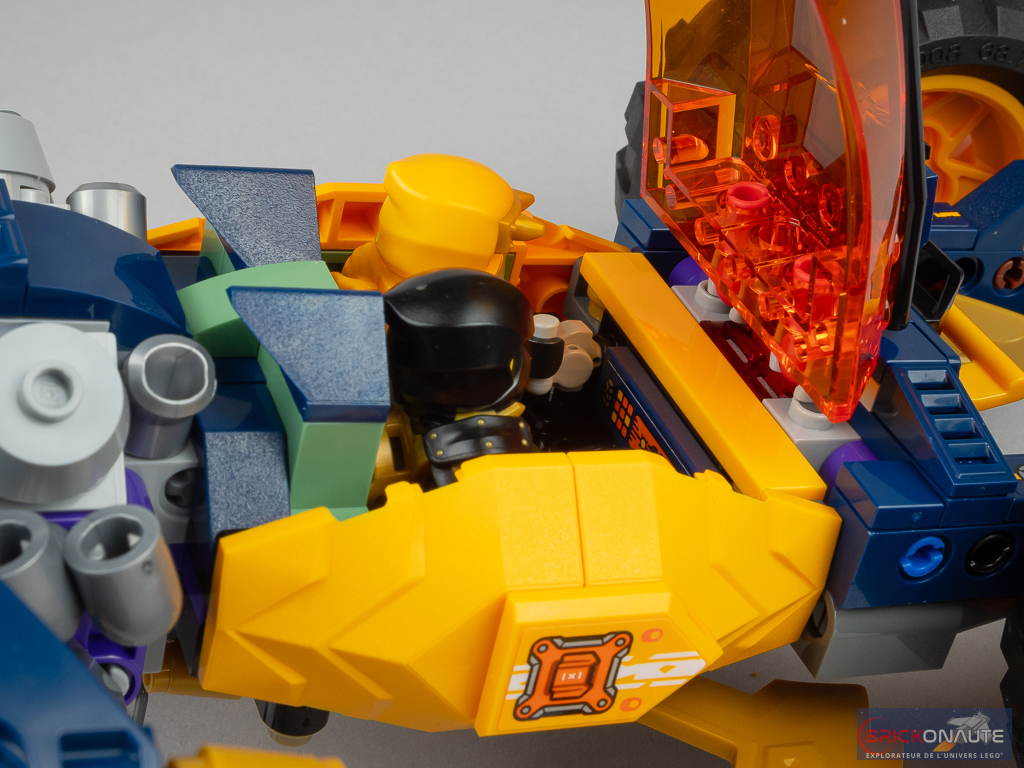 Pour rester sur les couleurs, le choix opéré par le designer avec ce mélange de dark blue et de flame yellowish orange, ponctué d’éléments dorés est du plus bel effet. J’aime aussi beaucoup que ces deux couleurs différentes soient ici réemployées sur les jantes. L’intérieur de l’habitacle est assez spartiate mais permet tout de même d’y installer deux minifigs. Pas de volant, il est remplacé par un guidon à la verticale.