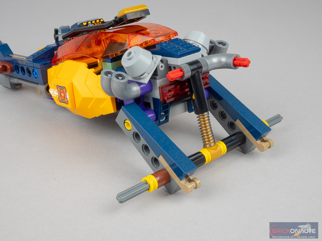 Pour rester sur les couleurs, le choix opéré par le designer avec ce mélange de dark blue et de flame yellowish orange, ponctué d’éléments dorés est du plus bel effet. J’aime aussi beaucoup que ces deux couleurs différentes soient ici réemployées sur les jantes. L’intérieur de l’habitacle est assez spartiate mais permet tout de même d’y installer deux minifigs. Pas de volant, il est remplacé par un guidon à la verticale.