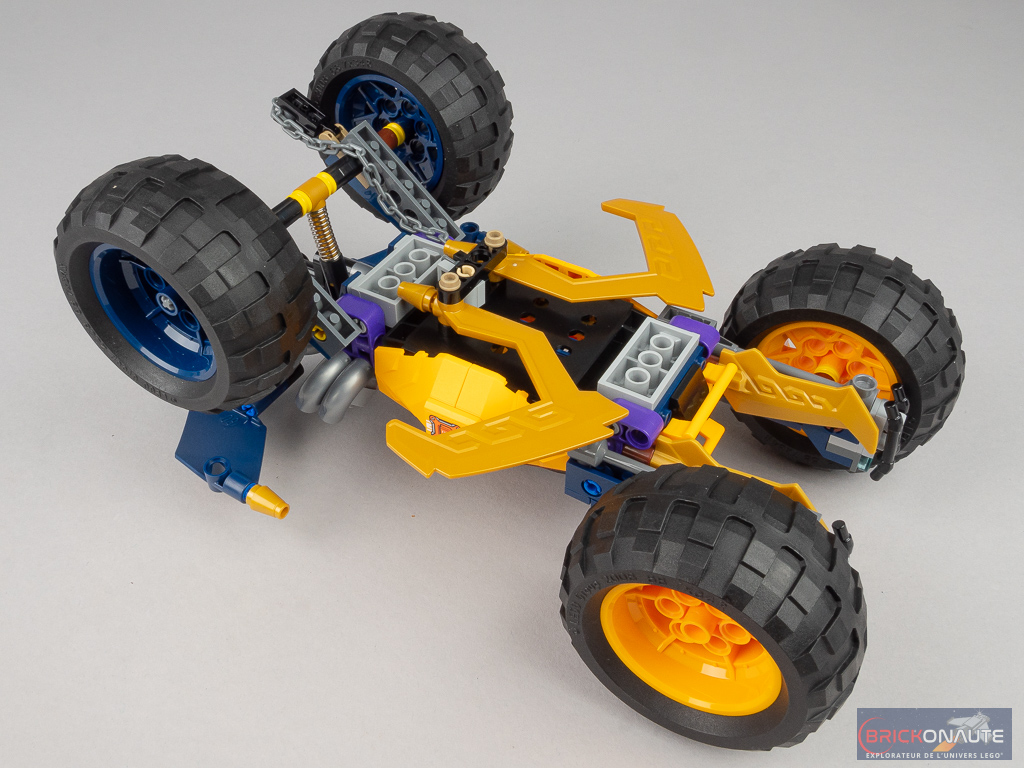 En plus d’être sympa pour son design, ce buggy l’est également pour sa jouabilité. Plusieurs choses à noter au delà du fait qu’il s’agisse d’une voiture et donc… qu’elle roule, tout simplement. La suspension arrière est fonctionnelle avec un amortisseur central et un petit assemblage d’éléments Technic, deux stud shooters nouvelle génération sont installés sur les ailes arrières (il renferment chacun 3 munitions à éjecter en poussant sur l’axe) et une chaîne avec deux grosses lames peut être traînée derrière l’engin. Il est également possible de fixer ce sous-ensemble en dessous du buggy, c’est bien pensé.