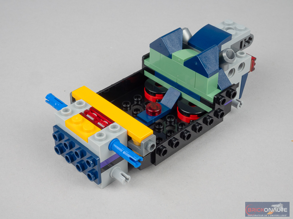 Pour rester sur les couleurs, le choix opéré par le designer avec ce mélange de dark blue et de flame yellowish orange, ponctué d’éléments dorés est du plus bel effet. J’aime aussi beaucoup que ces deux couleurs différentes soient ici réemployées sur les jantes. L’intérieur de l’habitacle est assez spartiate mais permet tout de même d’y installer deux minifigs. Pas de volant, il est remplacé par un guidon à la verticale.