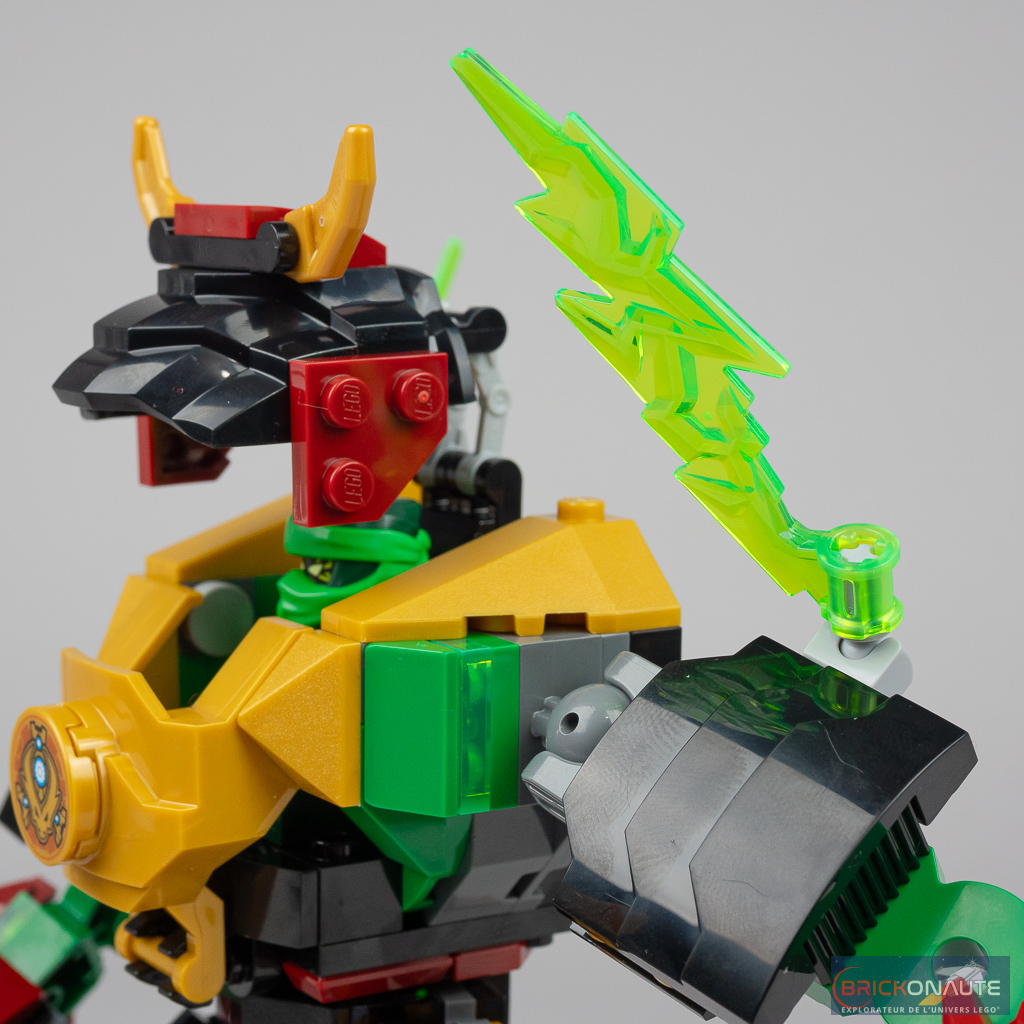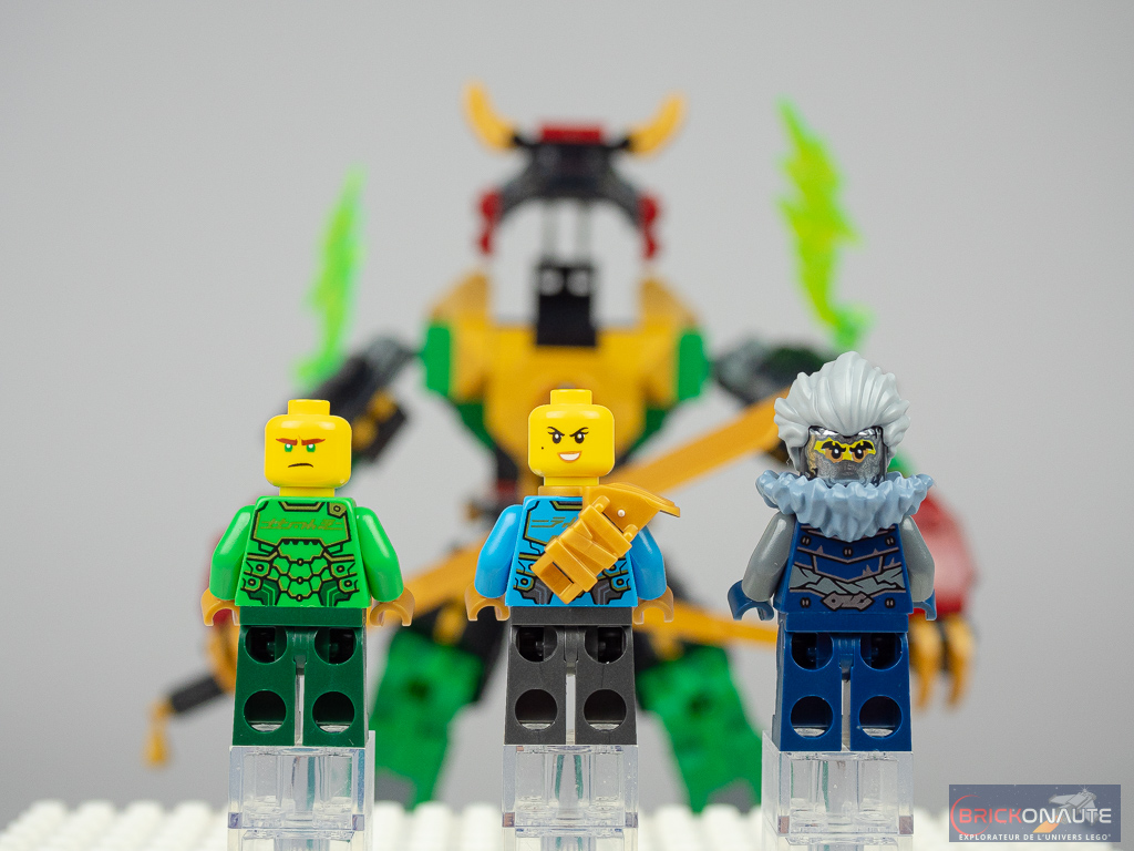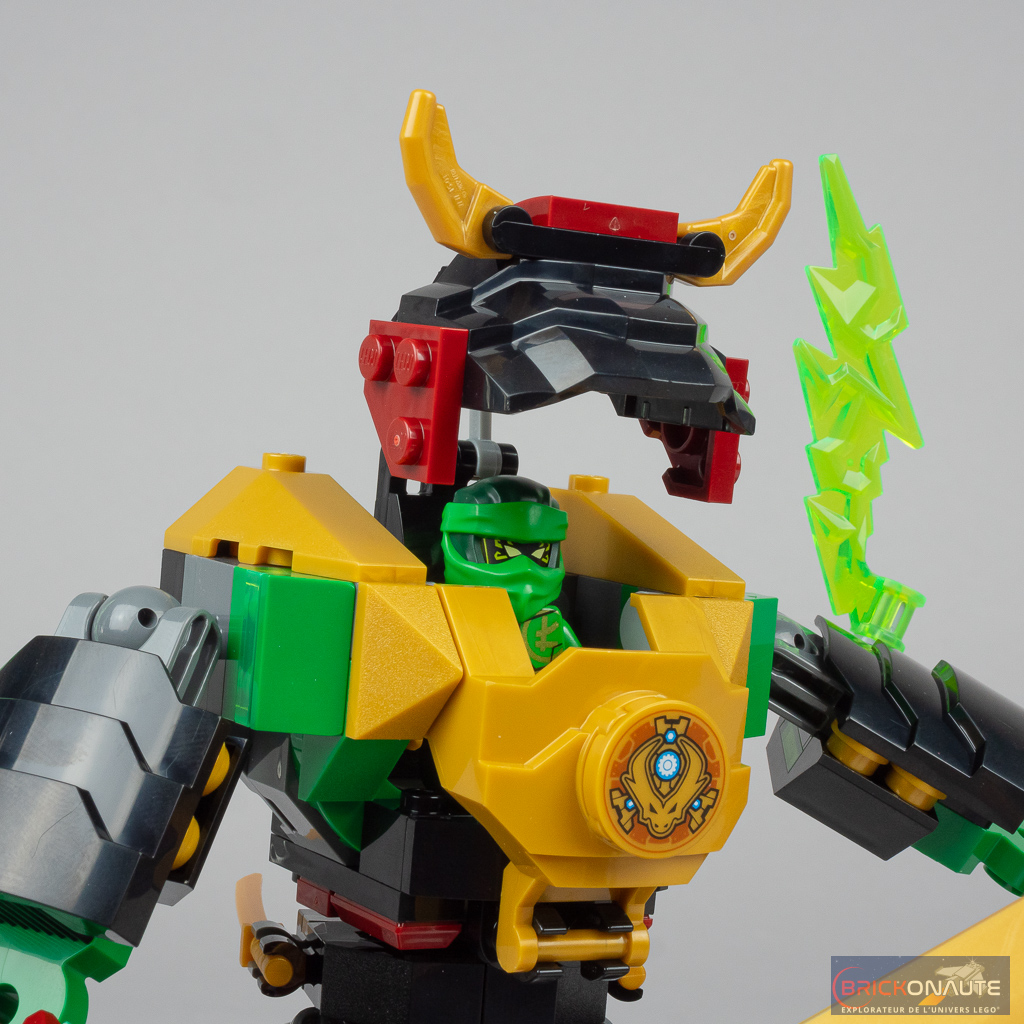 Petit détour par les minifigs pour commencer, elles sont au nombre de 3 : Lloyd et Nya dans une version « mech » et le méchant Lord Ras. Comme d’habitude dans la gamme LEGO Ninjago il n’y a pas grand-chose à redire sur la réalisation, elles sont superbes – avec une petite réserve sur la tête de Lord Ras, dont la tampographie est réalisée sur une pièce grise translucide : le jaune est un peu terne.