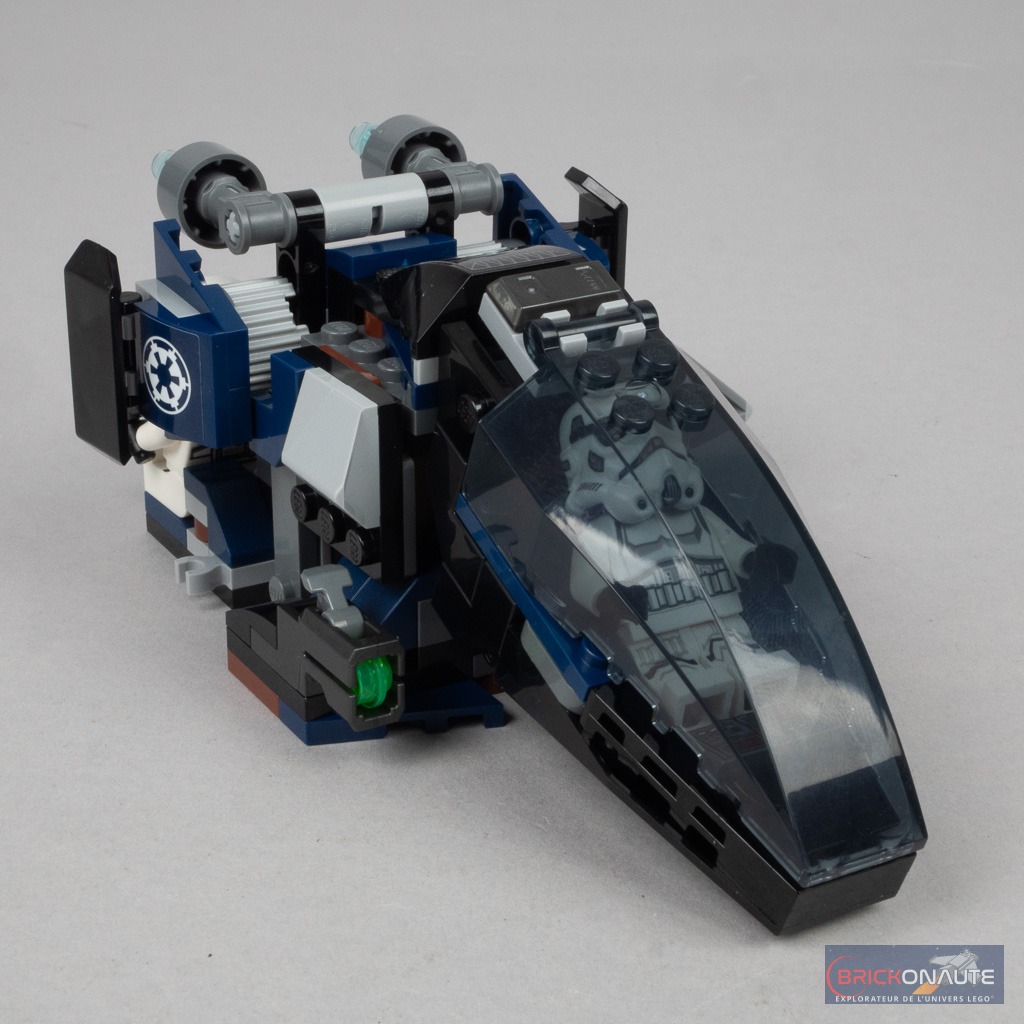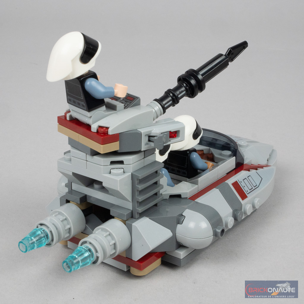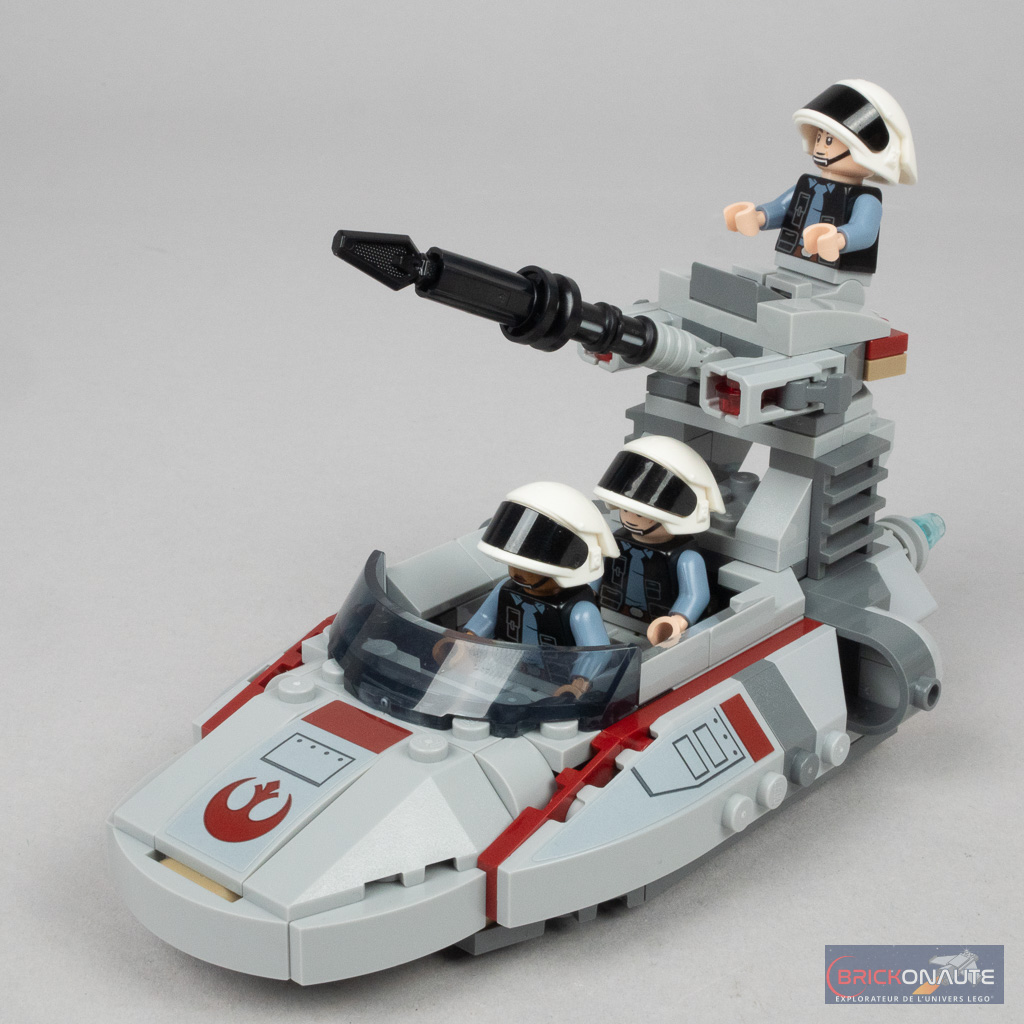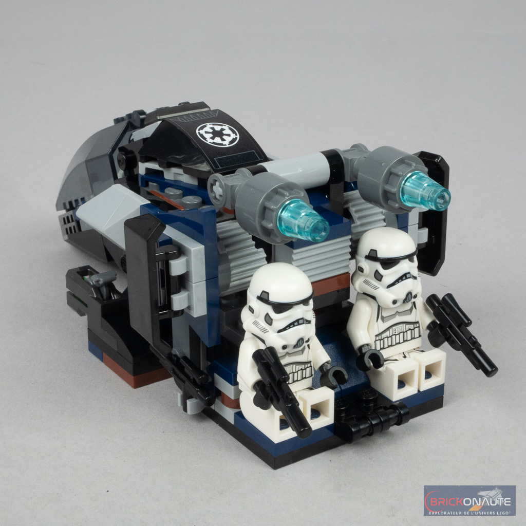 Côté jouabilité, ça fait le job. Les deux engins disposent de stud-shooters et d’éléments détachables : une tourelle du côté du rebel Scout Speeder, et une petite plateforme à l’arrière de l’Imperial Dropship pour déposer les Stormtroopers. Concernant ce dernier, la verrière s’ouvre pour dévoiler le poste de pilotage, l’angle des propulseurs est ajustable, et la plateforme arrière dispose de clips pour fixer les blasters. Notez également que les deux engins sont conçus pour accueillir les 3 minifigs correspondantes.