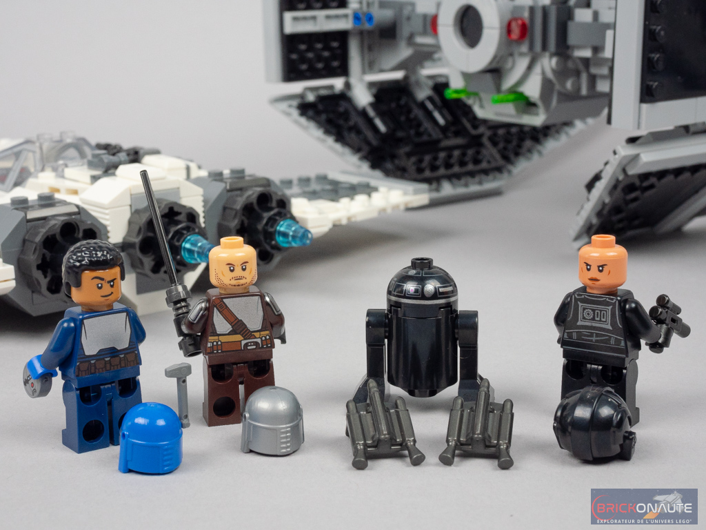 Parmi les 4 minifigs proposées, deux sont inédites : le droïde astromécano R2-E6 et le Mandalorian Fleet Commander – ou commandant de la flotte mandalorienne. Les deux autres minifigs sont nettement plus courantes avec la très jolie version du Mandalorien / Din Djarin qu’on a vu dans de nombreux sets dernièrement, et le pilote de TIE, dont j’aime toujours autant le superbe casque.