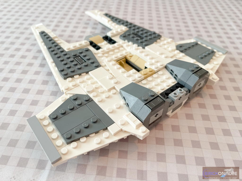 L’esthétique du vaisseau est plutôt fidèle à son alter-ego sur petit écran, dans la forme et dans les proportions. L’utilisation des wedges grises reproduit bien le schéma de couleurs vu à l’écran. Juste un petit regret sur la forme globale, j’aurais aimé que les ailes soient légèrement détachées de l’avant du cockpit. Mais cela aurait probablement nui à la solidité de l’ensemble.