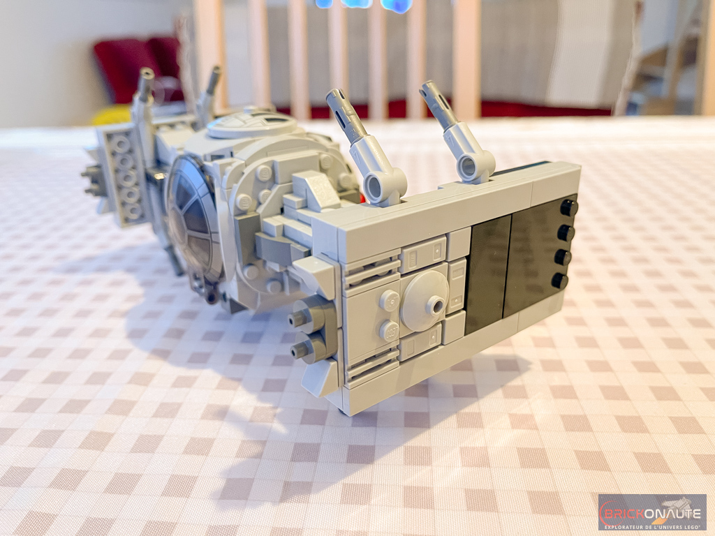 Globalement, on retrouve bien les formes agressives caractéristiques du TIE Interceptor. La forme des ailes est correcte, tout comme l’angle qu’elles prennent. J’aime également le fait que le designer ait pris le soin d’habiller la face intérieure d’éléments noirs, comme l’extérieur, ça fait propre. Grosse réserve néanmoins : les deux pins Technic bleus visibles à l’arrière sont vraiment moches. Autant c’est acceptable dans un set de la gamme LEGO Technic, autant ça l’est beaucoup moins dans la gamme LEGO Star Wars.