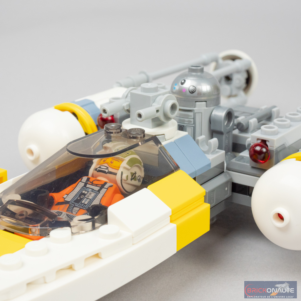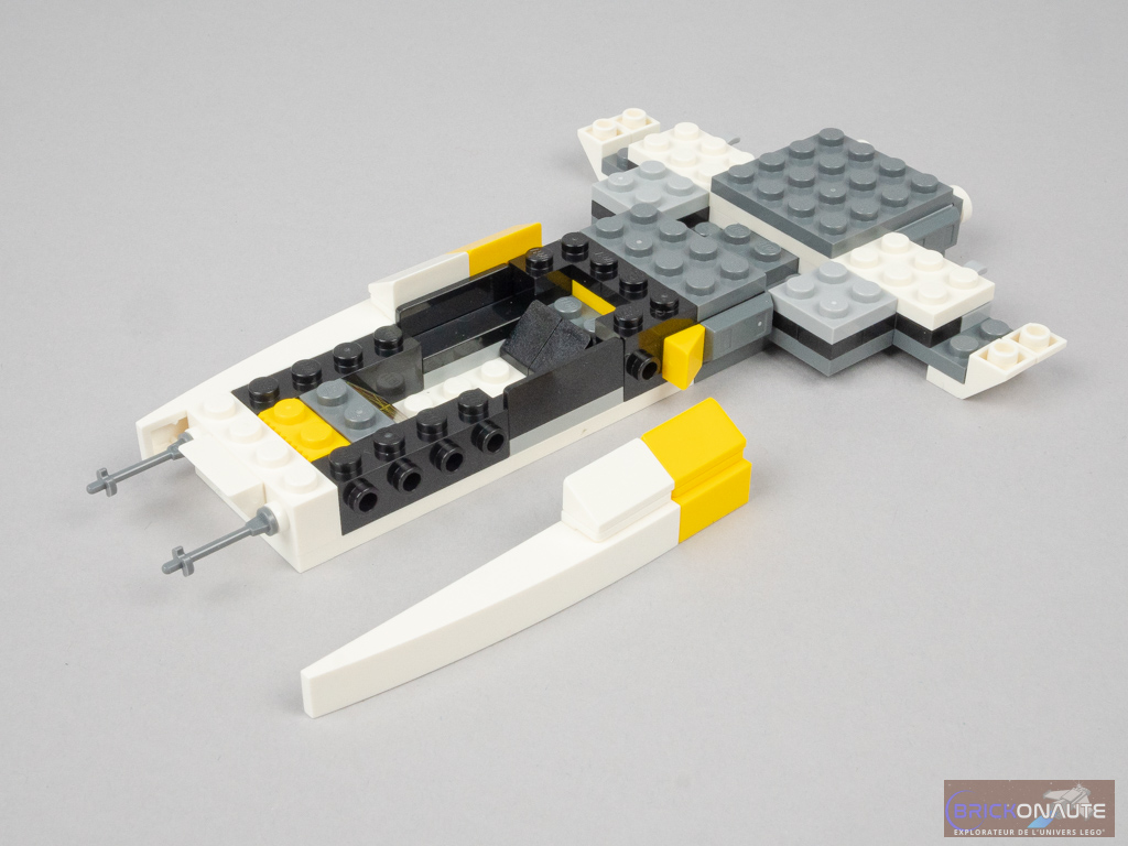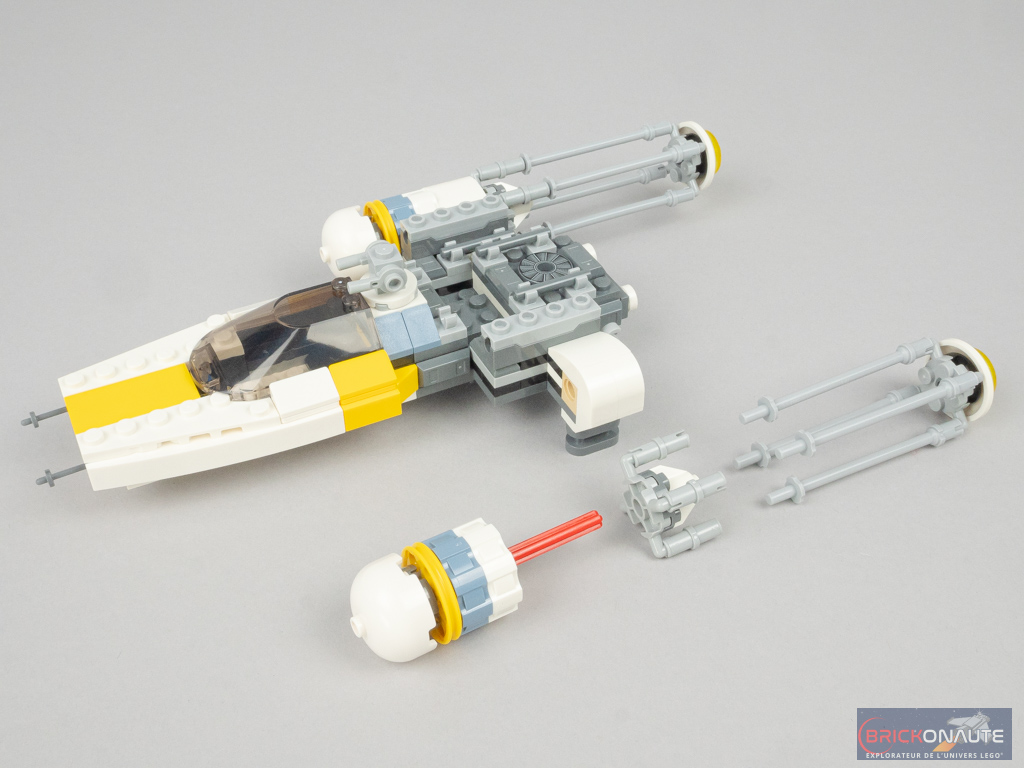 En prenant la construction dans l’ordre des notices / sachets de pièces, on commence par la construction du vaisseau Y-wing. La construction de la carlingue est assez basique, et utilise quelques éléments SNOT pour fixer des slopes sur les côtés et donner au vaisseau une forme vaguement profilée. L’assemblage des moteurs est plus sympa : ils se décomposent en 3 éléments enchâssés dans un axe Technic, et le résultat est plutôt cohérent.