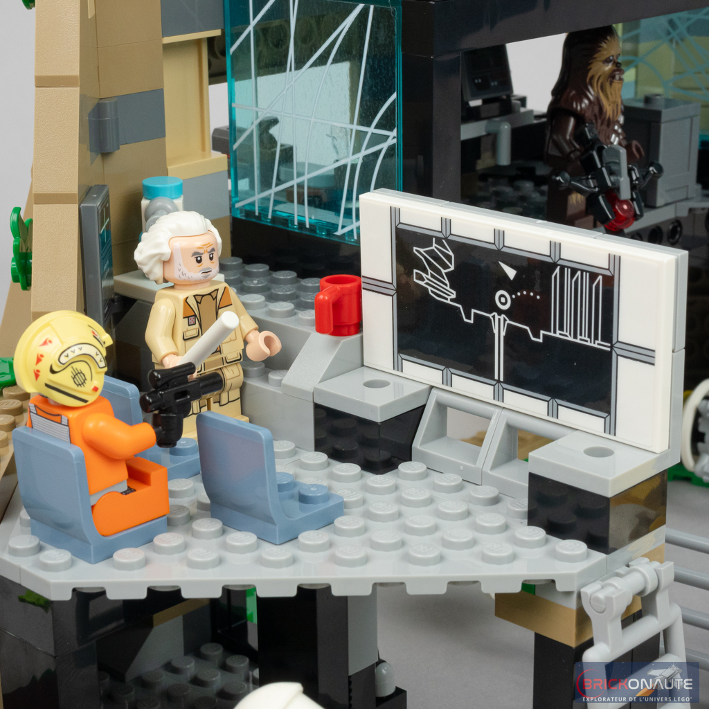 La base est conçue de façon modulaire, et chacune des notices qui suivent proposent la construction d’un module séparé. La construction du premier module est plutôt simple, on remarquera surtout les charnières qui permettent de rabattre le mur avec l’angle désiré. Le rez-de-chaussée est un peu vide, mais le premier étage abrite une salle de briefing avec 3 fauteuils et un écran sur lequel on devine l’attaque de l’Étoile Noire. Côté extérieur, les murs couleur dark tan sont ponctués de quelques touches de végétation.