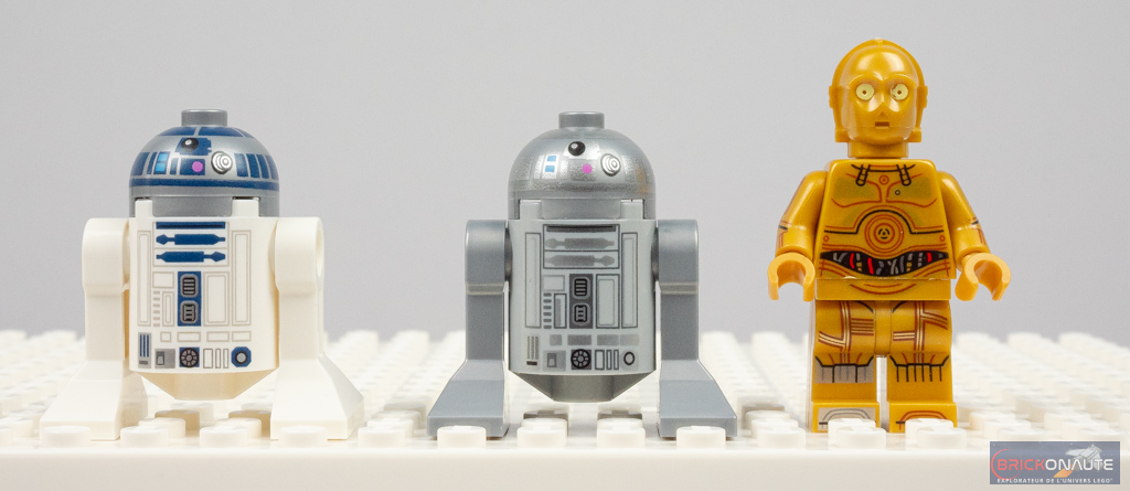 Côté droïdes, on obtient R2-D2, R2-BHD et C-3PO. R2-D2 réutilise le cylindre tampographié des deux côtés, qui devient désormais la norme dans la gamme. R2-BHD est inédit dans cette finition mais n’est tampographié que d’un seul côté. On avait déjà pu le trouver dans une version légèrement différente dans le gros set 75181 Y-Wing Starfighter sorti en 2018. Enfin, C-3PO est présent dans une version introduite l’an dernier, avec une très jolie tampographie du torse, des bras et des jambes.