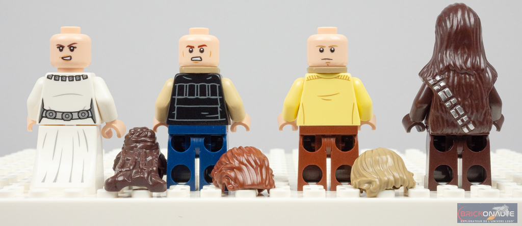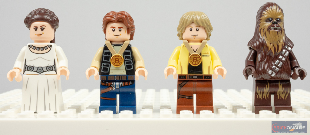 Du côté des « héros », on remarquera le torse inédit de la princesse Leia avec un joli collier, et sa longue coiffure. Les tenues de Han Solo et Luke Skywalker sont également inédites – le haut de Han est d’ailleurs un peu terne, comme d’habitude lorsque des couleurs claires sont tampographiées sur des fonds foncés. LEGO nous propose d’ailleurs une très jolie médaille tampographiée pour ces deux personnages. Il y en a une troisième en rab, mais il sera malheureusement impossible de la passer autour du cou de Chewbacca – identique à la version vue depuis plusieurs années dans de nombreuses références.