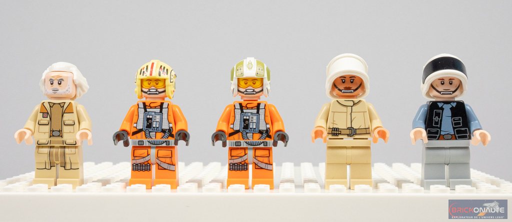 Le Général Dordonna est proposé dans une tenue identique à celle vue dans le set 75301 Luke Skywalker’s X-Wing Fighter, et les deux pilotes Garven Dreis (Red Leader) et Jon Vander (Gold Leader) portent la même combinaison que Luke dans les sets 75301 Luke Skywalker X-wing Fighter et 75313 AT-AT, mais leurs deux casques sont inédits et superbement tampographiés. Les deux derniers personnages sont des membres d’équipage dans des tenues inédites avec un rebel fleet trooper et un rebel crew anonymes.