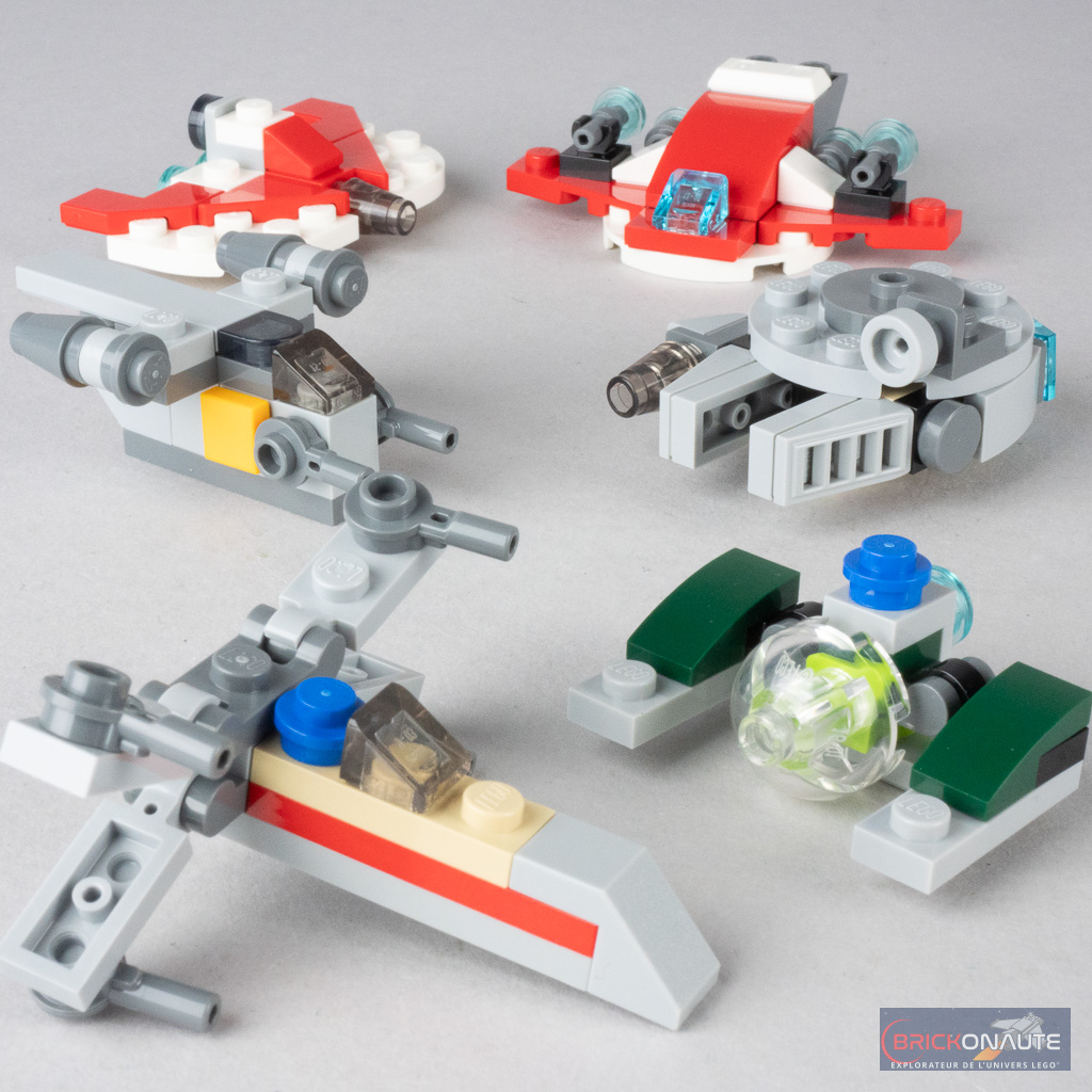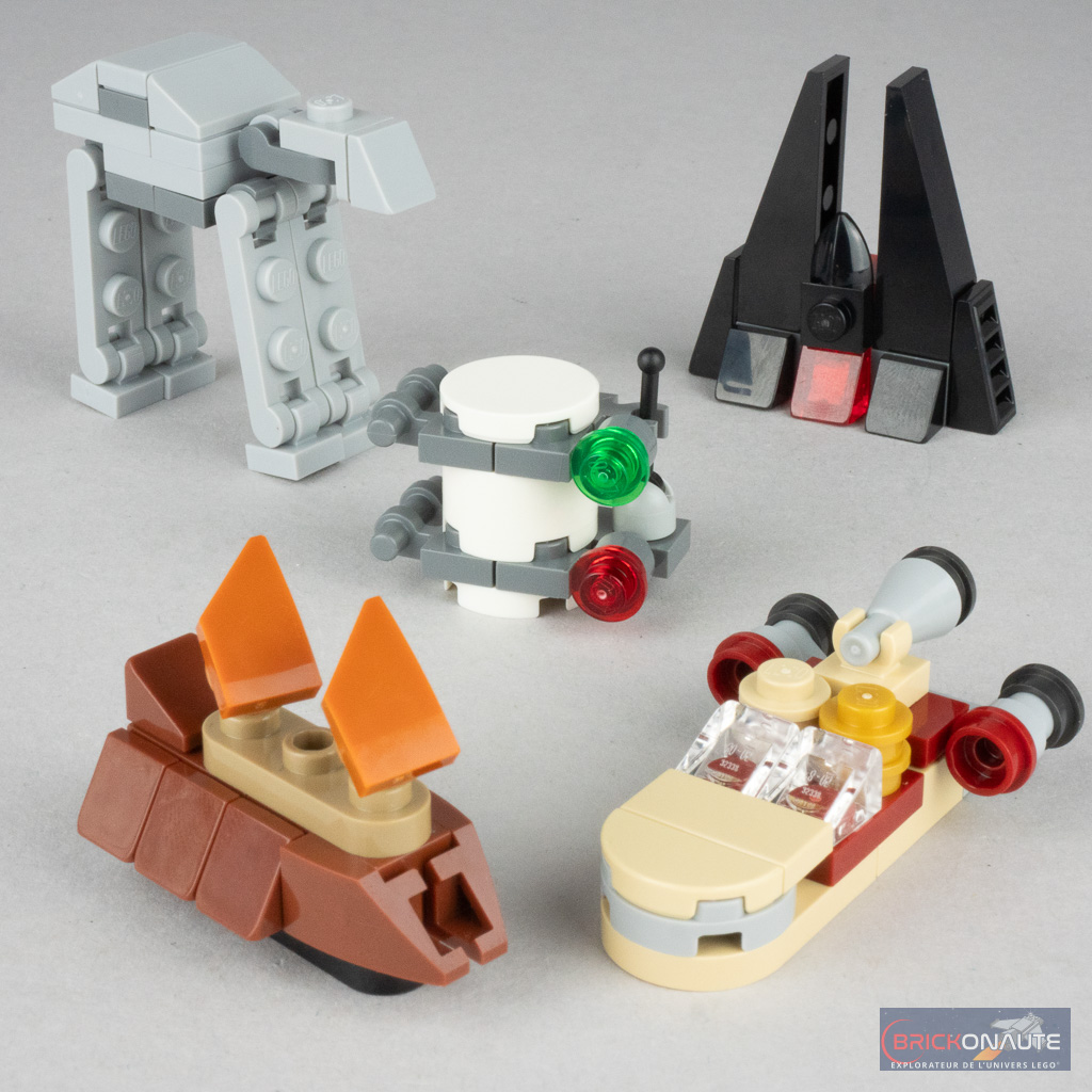 Pour le reste, il s’agit donc de 18 mini-constructions diverses et variées, où les designers font preuve d’inventivité pour reproduire essentiellement des vaisseaux (X-wing, Y-wing, chasseur TIE, Venator, Millennium Falcon, Razor Crest, le vaisseau de Yoda…) et quelques engins terrestres avec la barge de Jabba, un AT-AT ou un landspeeder. On retrouve également une mini-version du château de Dark Vador et un minikit – objet à collectionner dans les jeux vidéo LEGO Star Wars.