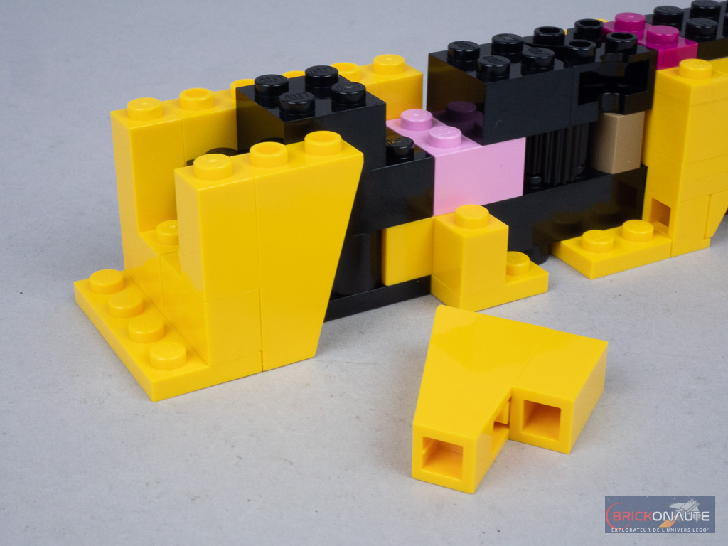 Je ne m’attendais pas à grand-chose concernant l’expérience de construction, mais j’ai été plutôt agréablement surpris. Malgré une apparente simplicité, le set fait appel à quelques « techniques » (du SNOT avec des clips, des montages de pièces « à l’envers »…) et sous-assemblages improbables pour arriver au design final. L’expérience est divertissante, et on ne s’ennuie pas pendant la grosse heure nécessaire.