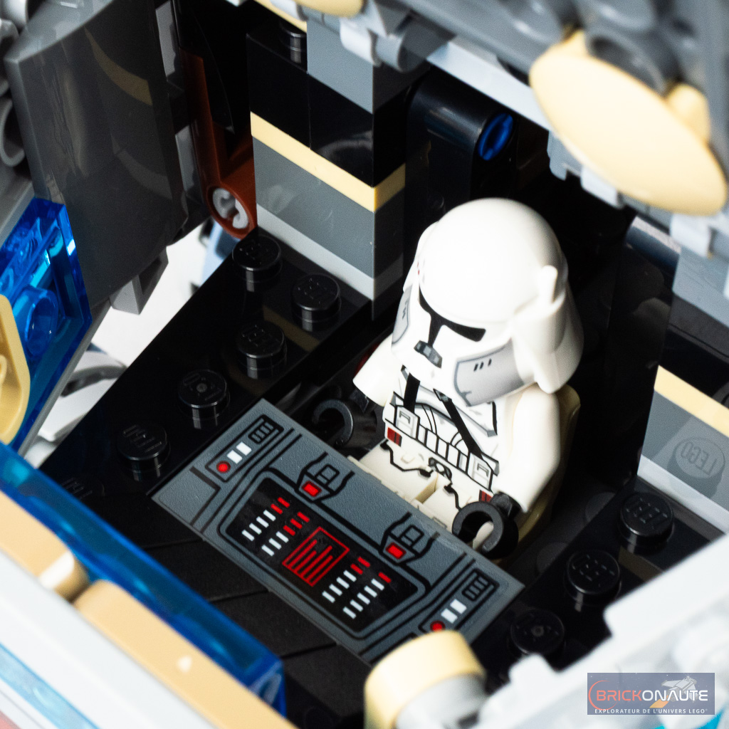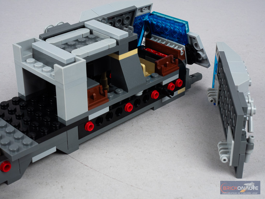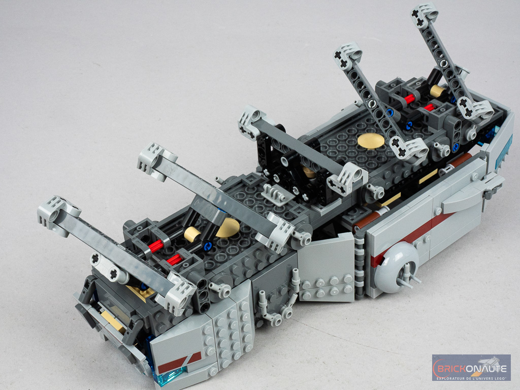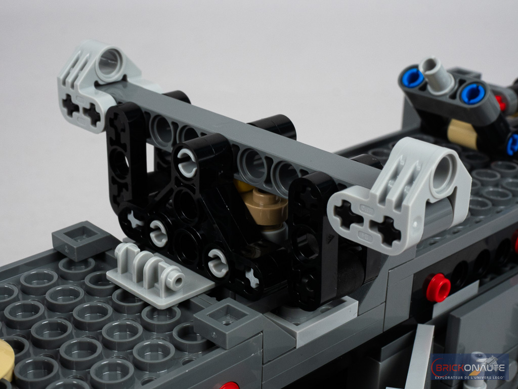 Et niveau jouabilité justement, c’est du tout bon. On retrouve les habituels stud shooters qui permettent de tirer sur tout le monde (même si celui à l’arrière aurait mérité d’être monté sur une tourelle), une petite vigie extensible (simplement positionnée sur un axe Technic à tirer), et un intérieur facilement accessible et aménagé.