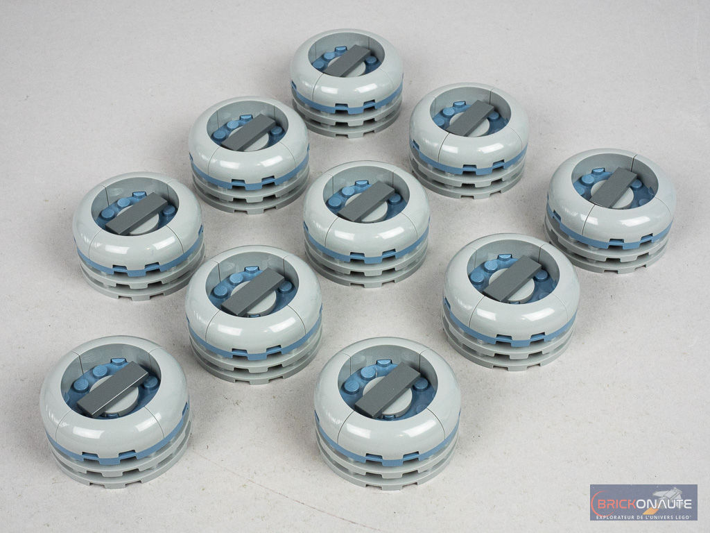 À l’intérieur de la boîte au format allongé, on trouve 6 sachets de pièces numérotés, un 7ème sachet sans numéro avec quelques plates rondes, et une pochette en papier contenant la notice d’instructions et la petite planche de 7 autocollants. Rien de sensationnel dans l’inventaire si ce n’est justement les 10 plates rondes de 6×6 tenons en sand blue, une nouvelle couleur pour cet élément.