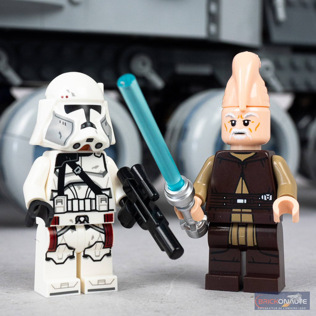 Du côté des autres personnages, on trouve une très jolie version de Ki-Adi-Mundi et du commandant Bacara. La tenue du premier est inédite même si visuellement très proche de celle proposée dans la référence 75206 Jedi and Clone Troopers Battle Pack. Quant au second, à l’instar des marines galactiques, il est proposé avec un tout nouveau casque très joliment tampographié – et une tenue inédite. La remarque sur la « jupe » absente pour les marines galactiques est également valable pour ce personnage.