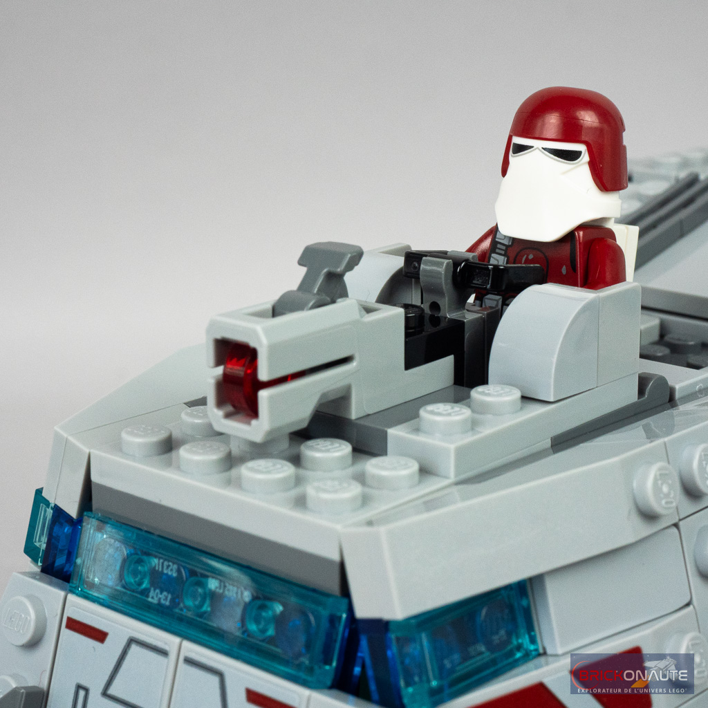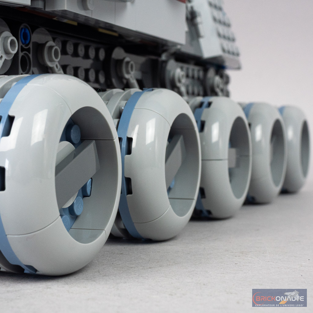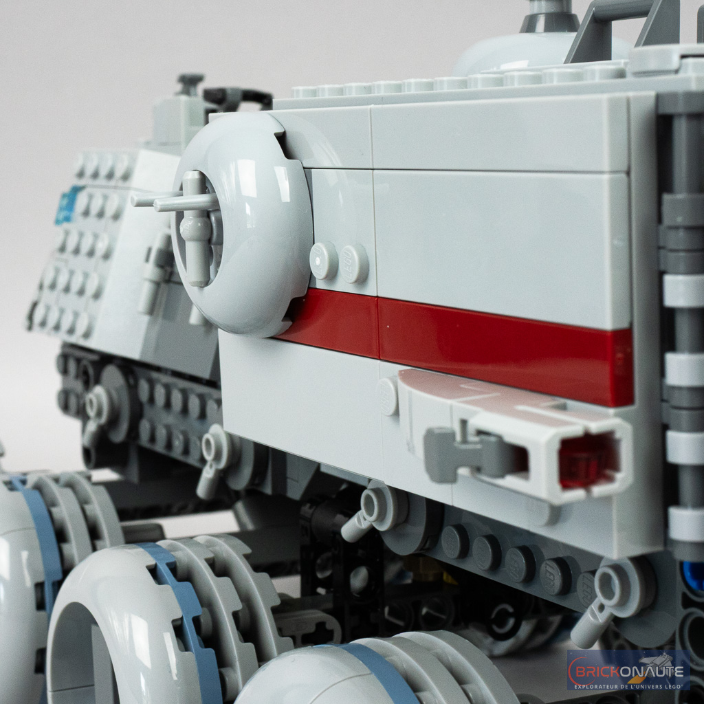 Les formes de l’engin se prêtent plutôt bien à une conversion en LEGO et le designer a bien fait le job, avec des sous-ensembles qui s’ajustent bien, laissant peu de vides. On retrouve bien les couleurs caractéristiques de la machine, avec cette bande dark red ou les pare-brise bleus translucides. Je trouve également intéressante la bande sand blue qui vient souligner les formes des roues.