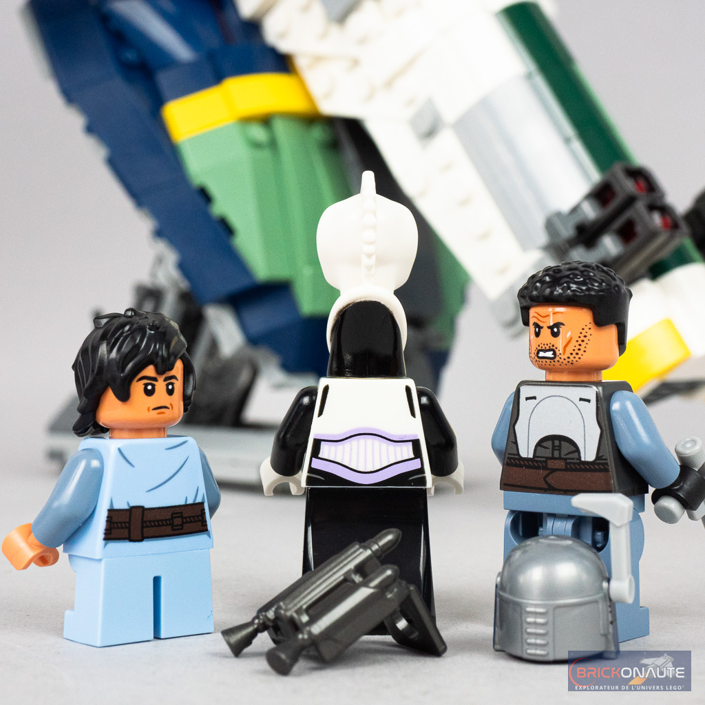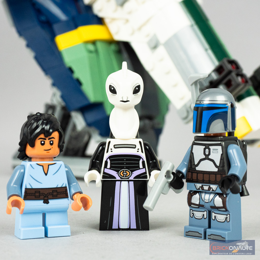 Il me reste à vous parler des minifigs, et elles sont au nombre de 3 avec Jango Fett, le jeune Boba Fett et Lama Su. Jango Fett est proposé dans une version très similaire à celle présente dans l’UCS 75409 Jango Fett’s Starship – la seule différence étant qu’il n’a ici pas les bras tampographiés. Tous les autres éléments sont identiques, dont le casque avec le nouveau range finder, et c’est franchement bien fait. Boba Fett est pour sa part totalement identique à la version du set 75409, et je ferai donc les mêmes remarques. On retrouve son haut bleu avec une ceinture marron, plutôt cohérent avec la tenue vue dans L’attaque des Clones, même si cette ceinture aurait plutôt dû être bleu foncé – et une paire de bottes aurait été bien vue.