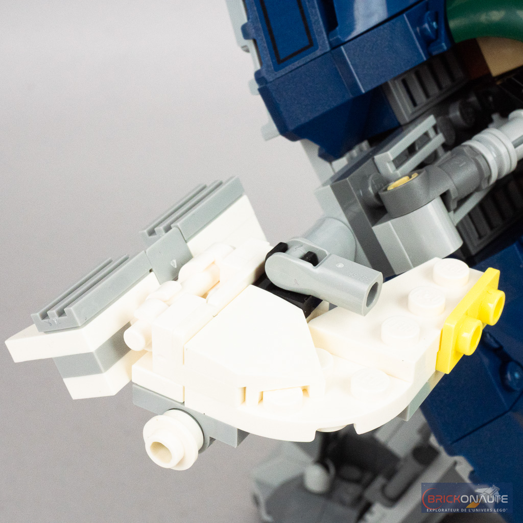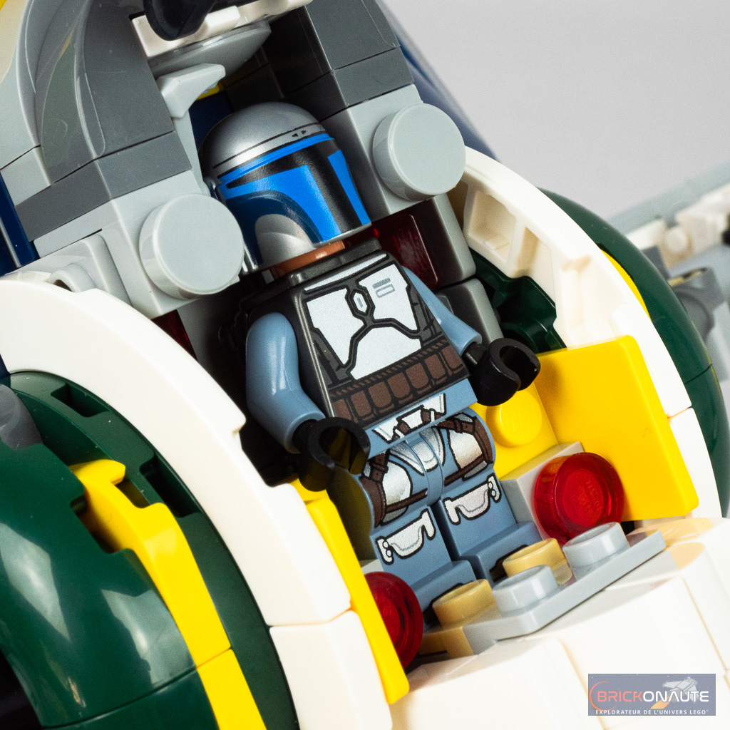 Si la version UCS s’adresse à un public de collectionneurs exigeants, le set qui nous intéresse aujourd’hui est clairement destiné aux plus jeunes avec une solidité à toute épreuve et quelques fonctionnalités. On retrouve les inévitables stud shooters pour tirer sur tout ce qui bouge, mais également un petit système de largage de charges sismiques plutôt bien fichu : en poussant sur un élément, une trappe s’ouvre sous le vaisseau et libère les charges en question. Il est possible de mettre Jango Fett aux commandes : il se tiendra debout dans le cockpit (dépourvu de toute manette, levier, panneau de commande…) mais pourra garder son jetpack.