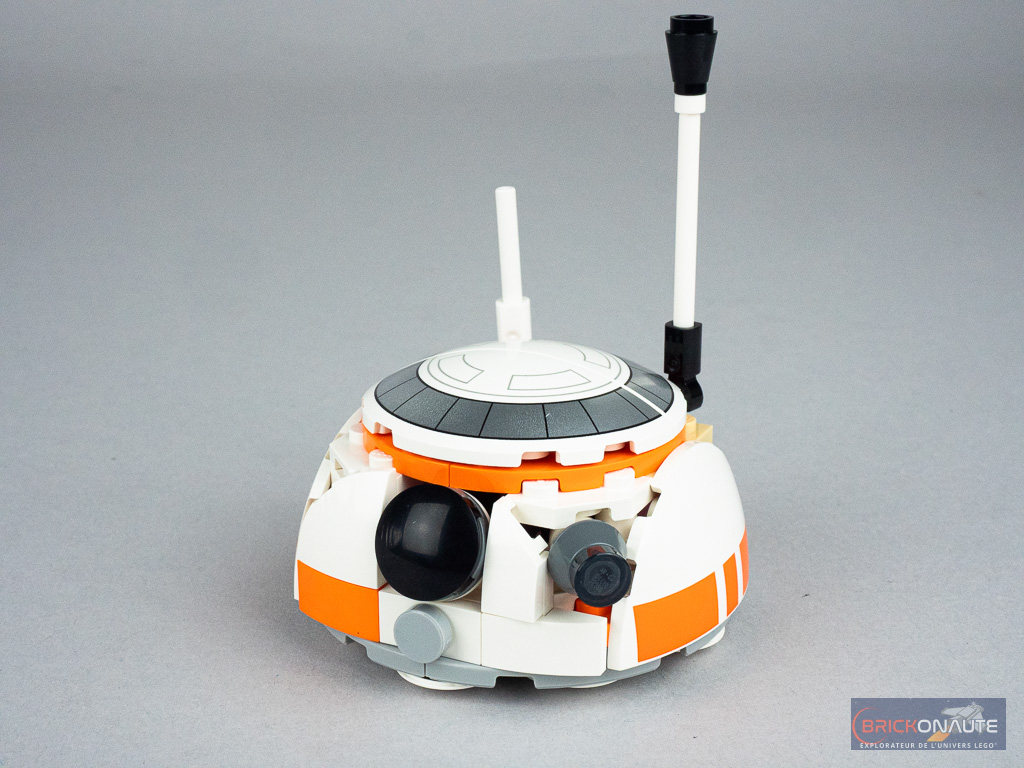 On ne va pas se mentir, c’est toujours difficile de représenter des courbes en pièces LEGO – et à fortiori une boule ici pour le corps de BB-8. Le résultat est donc un peu approximatif avec des alternances de sections plates et courbes, des angles trop marqués et des tenons visibles dans les « coins » qui font ici un peu bizarre sur une construction quasi studless.
