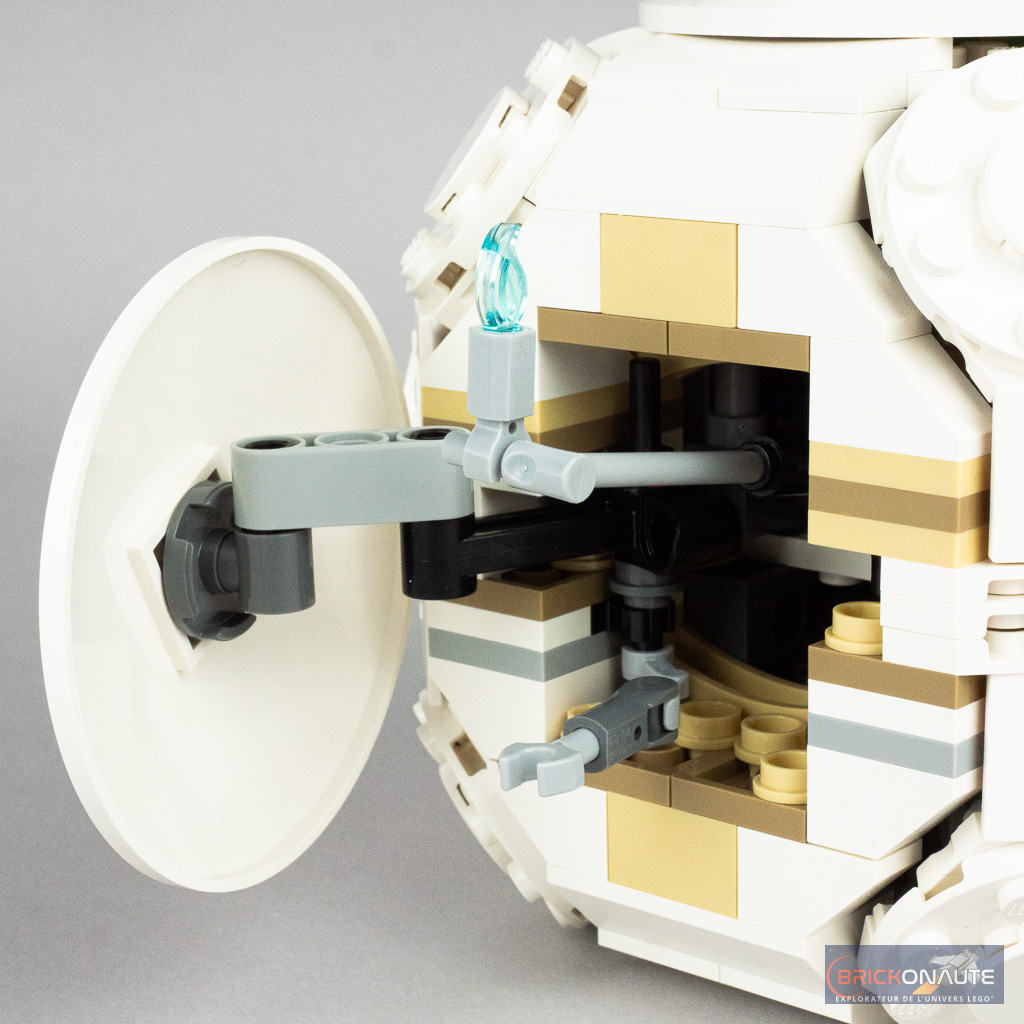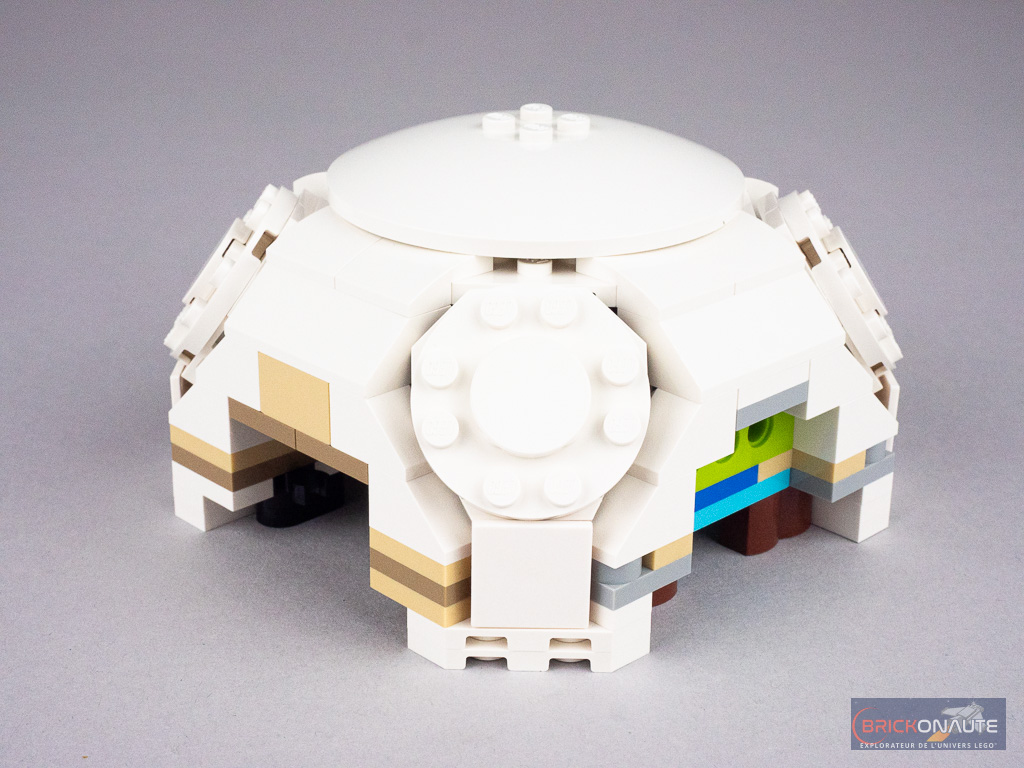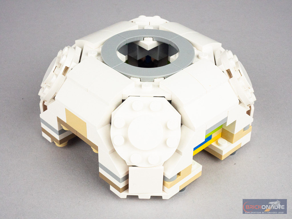 Vous l’aurez compris, l’étape suivante vise à assembler la coque supérieure, l’assemblage étant sécurisé par des éléments technic masqués sous les grandes coupoles (dishs) décorées. La construction se termine avec la tête qui fait également appel à quelques « techniques » intéressantes pour trouver les angles souhaités.