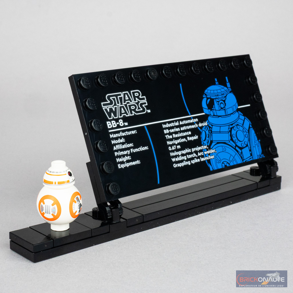 Comme d’habitude, BB-8 est livré avec une petite plaque de présentation distillant quelques infos sur le robot, et qui sert de support à son alter-ego à l’échelle minifig – déjà vu dans de nombreux autres sets de la gamme LEGO Star Wars.