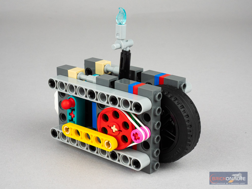 Le deuxième sachet de pièces est dédié à la partie « technique » de la construction avec le mécanisme qui permettra de faire tourner la tête du robot en le déplaçant. Une roue entraîne ici une courroie, qui met en mouvement une bielle permettant, par l’intermédiaire d’engrenages, de créer un mouvement d’aller-retour de la tête. Cet ensemble se fixe dans la coque inférieure assemblée précédemment.