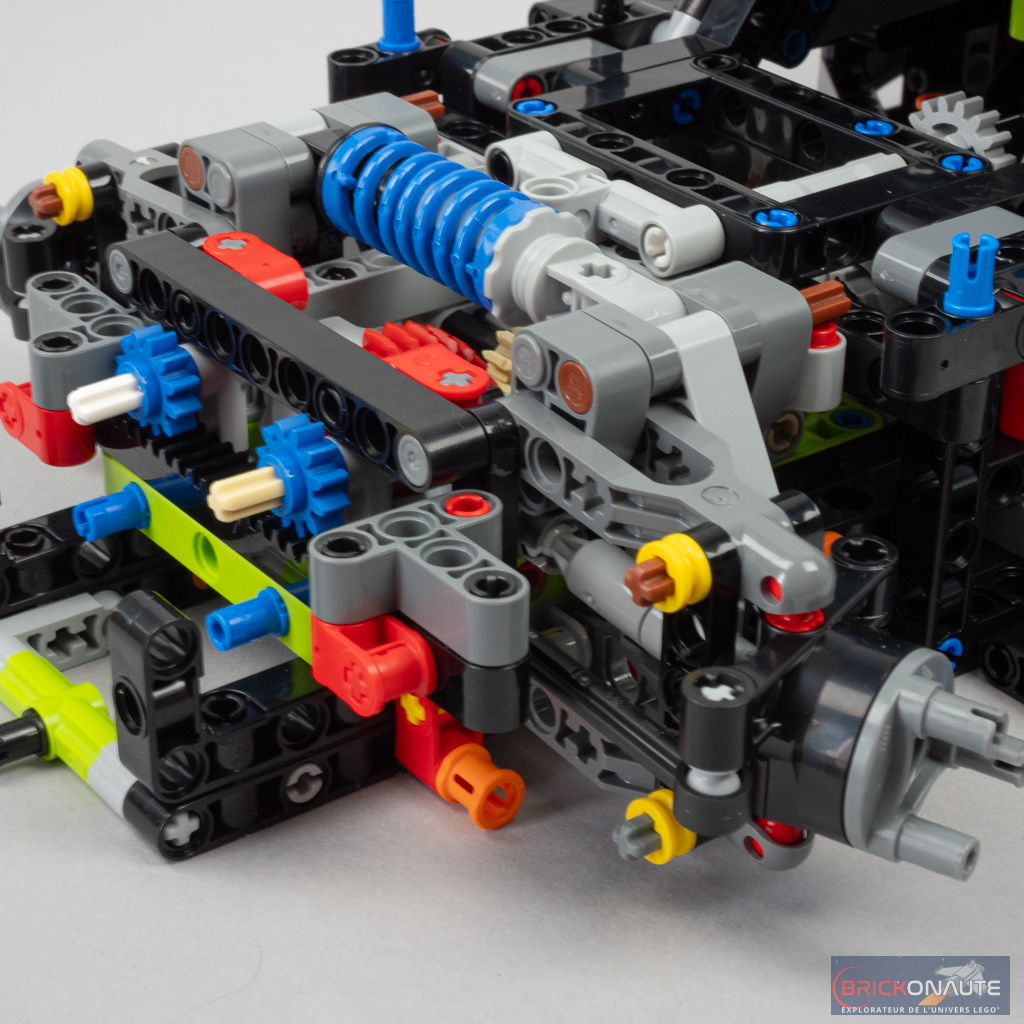 S’agissant d’un modèle de la gamme LEGO Technic, il se devait d’embarquer un certain nombre de fonctionnalités. La direction est fonctionnelle et renvoyée sur le volant (difficile à utiliser dans l’habitacle) et sur une HOG (Hand Of God – petite molette placée sur le toit). Les suspensions sont conçues de manière originale, avec un seul ressort placé à l’horizontale pour chaque essieu, ce qui n’empêche en rien d’avoir des suspensions indépendantes.