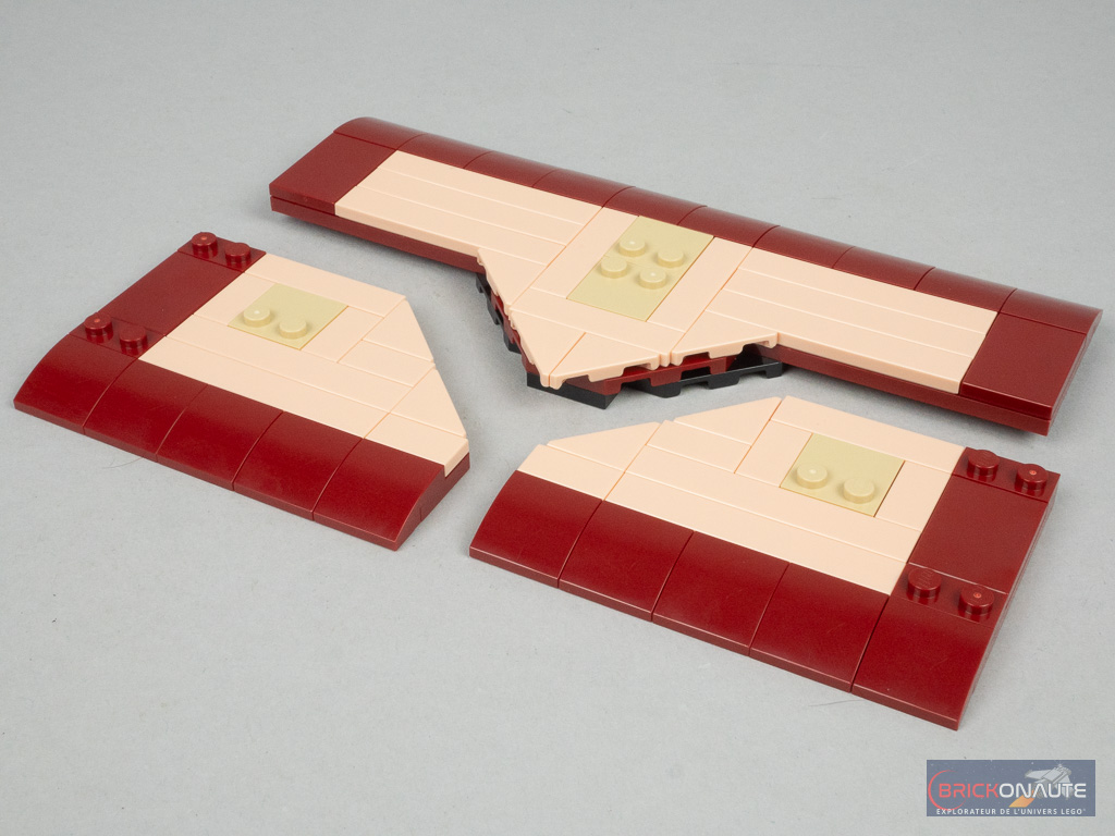La construction s’organise par « modules », articulés entre eux sur des charnières. On assemble la structure, on décore l’intérieur, puis le dos grâce à quelques brackets, et on passe au module suivant. Une fois les 3 modules achevés, on s’affaire à réaliser le toit (ou le couvercle de la malle, comme on veut). La construction s’achève par les 3 décorations sur la partie supérieure de la malle, avec une jolie fleur, un flacon vert qu’on imagine rempli d’une potion étrange, et une petite boîte à bijoux ronde.