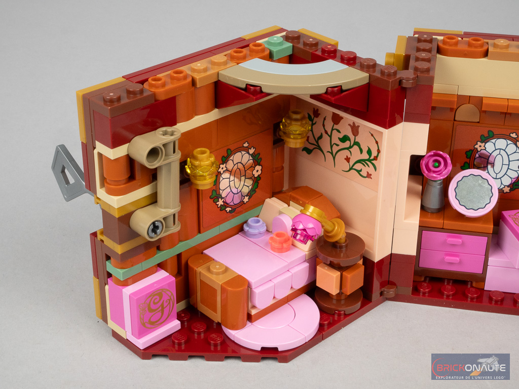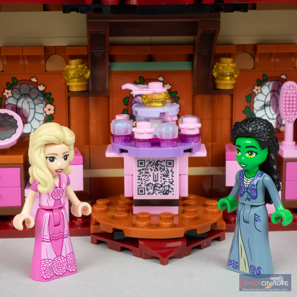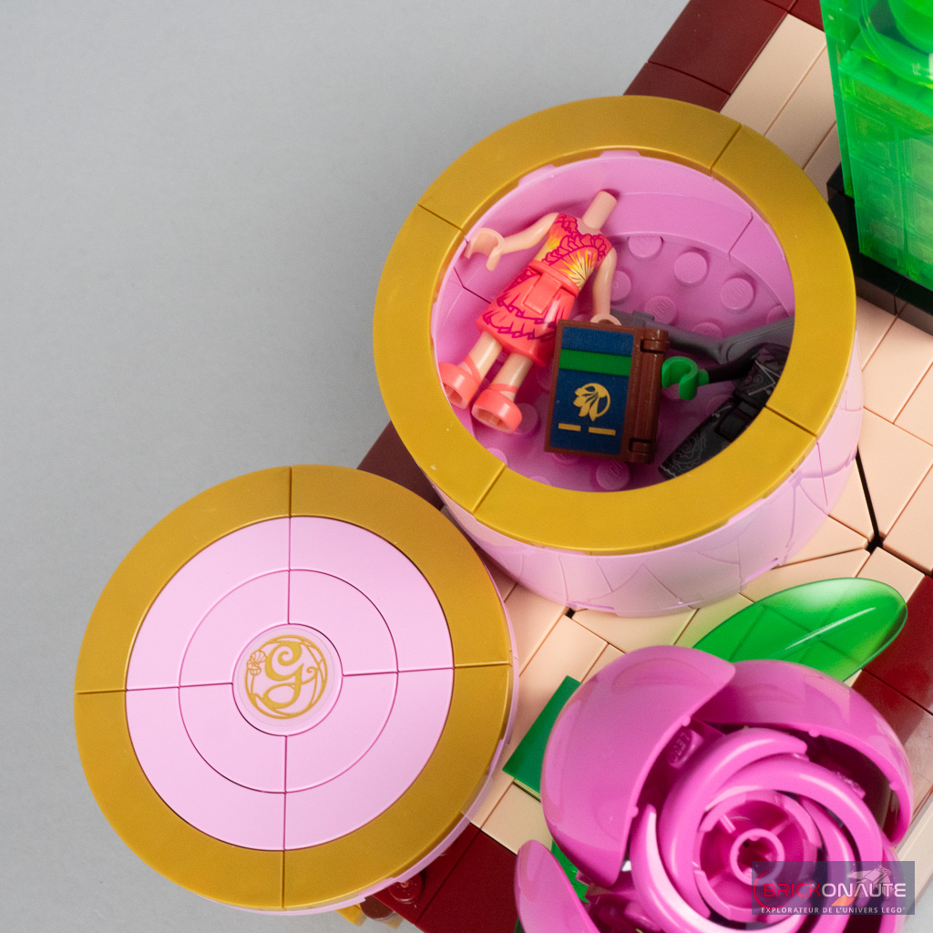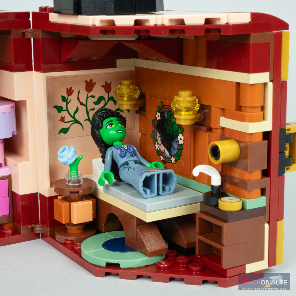 Il y a donc du bon, et du moins bon, dans le design. Du côté des bons points, j’aime beaucoup cette idée de « malle », une approche originale pour le dortoir de Glinda et Elphaba. Si la grande potion verte au-dessus est anecdotique, j’aime beaucoup la jolie fleur et la petite boîte, bien que très simple, permettra de ranger quelques accessoires comme les tenues supplémentaires des deux sorcières ou la clef de la malle. Clef qui « fonctionne » vraiment au passage, un petit mécanisme permettant ainsi de maintenir la malle fermée. Cette petite boîte rose pourra peut-être également servir de boîte à bijoux pour les plus jeunes.