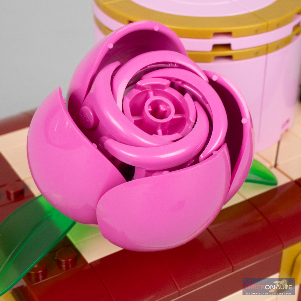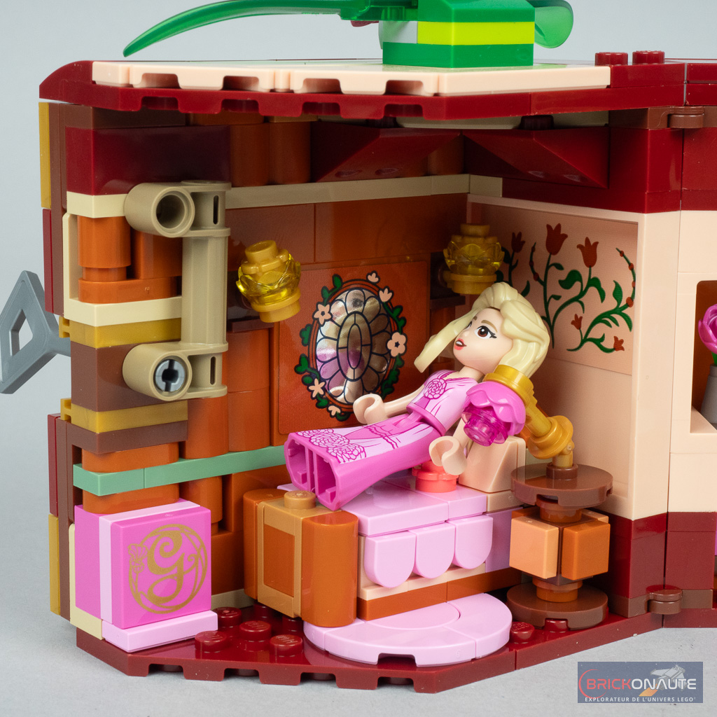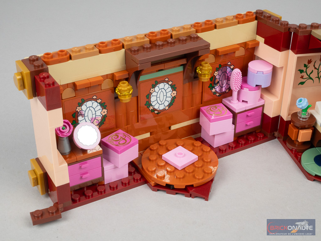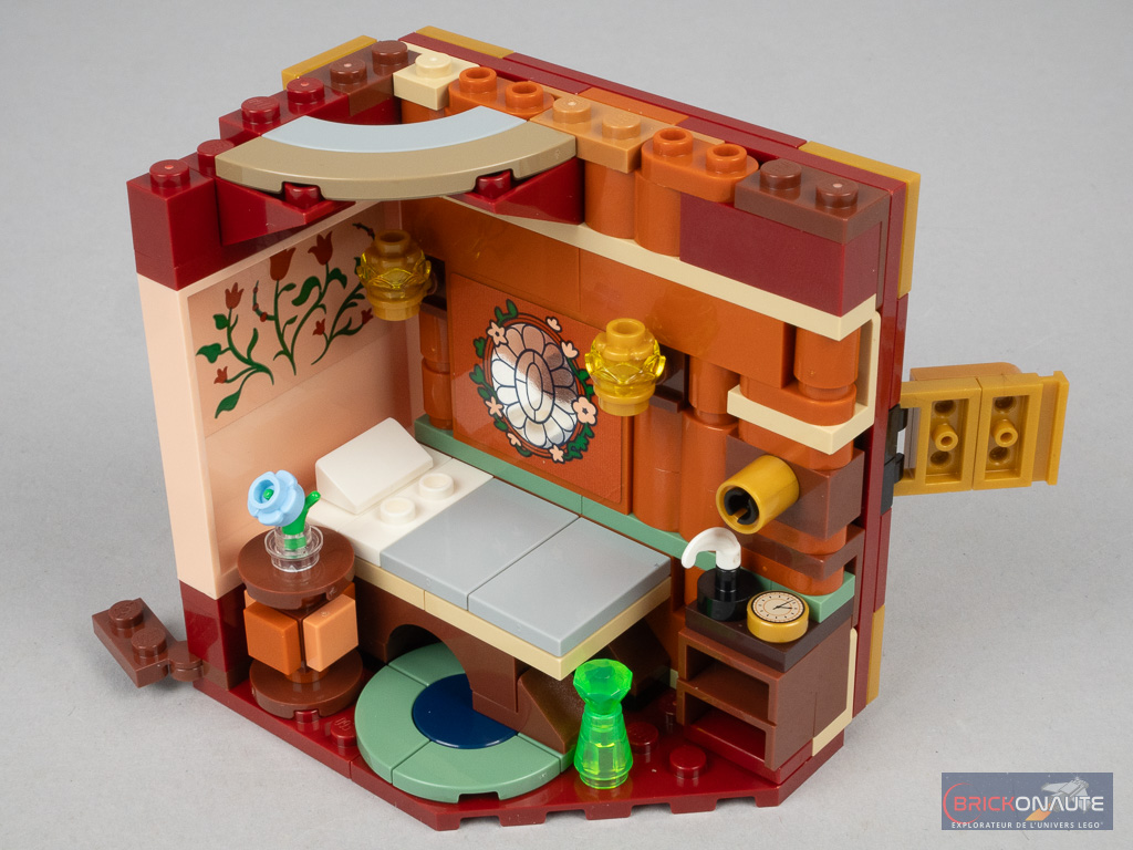 Il y a donc du bon, et du moins bon, dans le design. Du côté des bons points, j’aime beaucoup cette idée de « malle », une approche originale pour le dortoir de Glinda et Elphaba. Si la grande potion verte au-dessus est anecdotique, j’aime beaucoup la jolie fleur et la petite boîte, bien que très simple, permettra de ranger quelques accessoires comme les tenues supplémentaires des deux sorcières ou la clef de la malle. Clef qui « fonctionne » vraiment au passage, un petit mécanisme permettant ainsi de maintenir la malle fermée. Cette petite boîte rose pourra peut-être également servir de boîte à bijoux pour les plus jeunes.