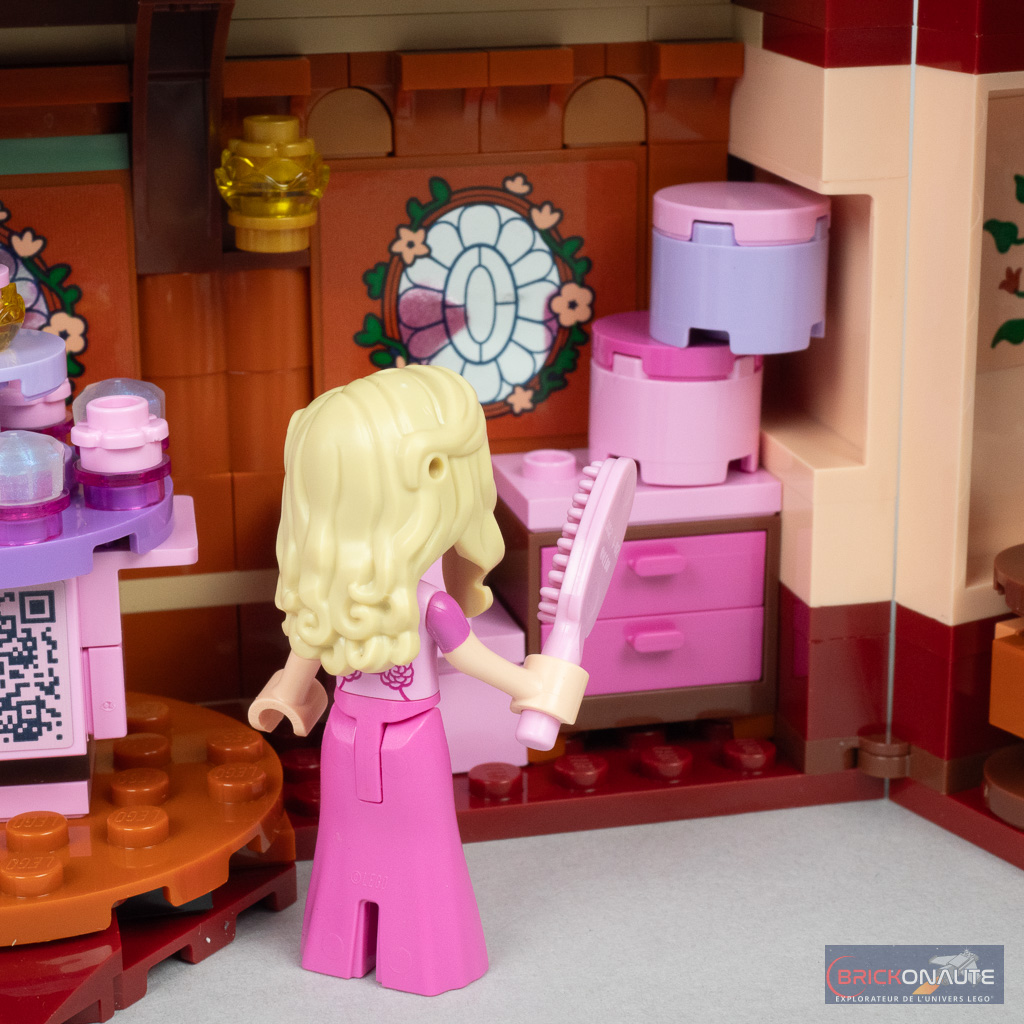 Ce format de malle a un avantage indéniable : offrir un espace jouable très intéressant une fois déployé. D’autant que le nombre d’accessoires fourni est important et permettra de recréer de nombreuses scènes ou de s’inventer ses propres histoires. On n’y trouve qu’une seule petite « fonctionnalité » : la partie centrale rotative. On pourra éventuellement y placer les minidolls, et elle révèle (comme dans les autres sets de la gamme) un QR code à scanner – qui d’après le descriptif officiel permettra d’écouter la chanson « Popular » du film.