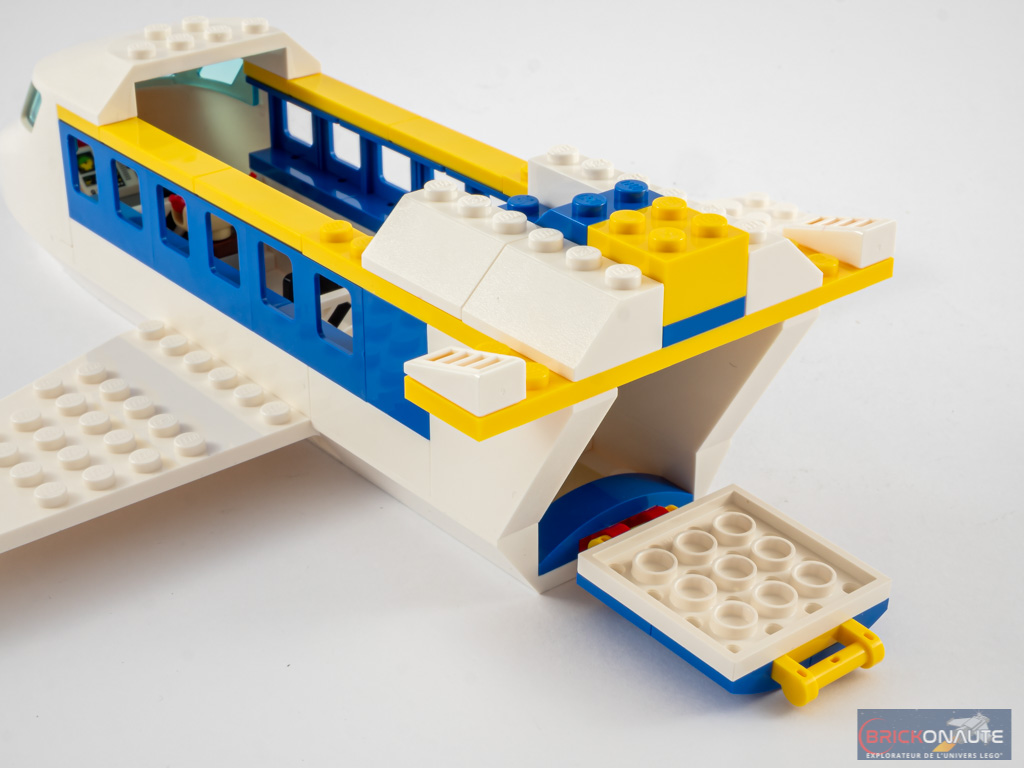 Pour continuer – vous le constatez sur les photos – la finition est très sommaire. C’est très souvent le cas dans les produits « 4+ », mais je trouve pour le coup que c’est vraiment trop sommaire. Il aurait été intéressant d’intégrer quelques détails supplémentaires : une tampographie du cockpit, des vitres pour les hublots ou des volets pour les ailes, par exemple. C’est mieux côté intérieur avec 4 espaces distincts : le cockpit, un siège passager avec un plateau repas à base de hot-dog, les toilettes et la soute.