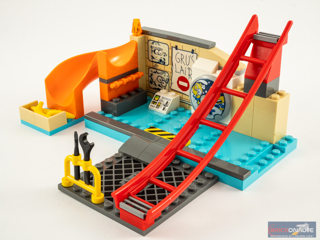 Ils leur offrira aussi un niveau de jouabilité plutôt intéressant pour une petite boîte comme celle-ci : quelques outils, un toboggan, un dish rotatif pour la machine à laver et un chariot dévalant un morceau de montagne russe. Il y a de quoi faire mais quitte à chipoter, je pense qu’il aurait été intéressant d’intégrer un mécanisme permettant de bloquer le chariot en partie haute (j’ai rajouté de mon côté quelques briques transparentes pour les photos) et de le faire descendre en actionnant un levier ou autre.