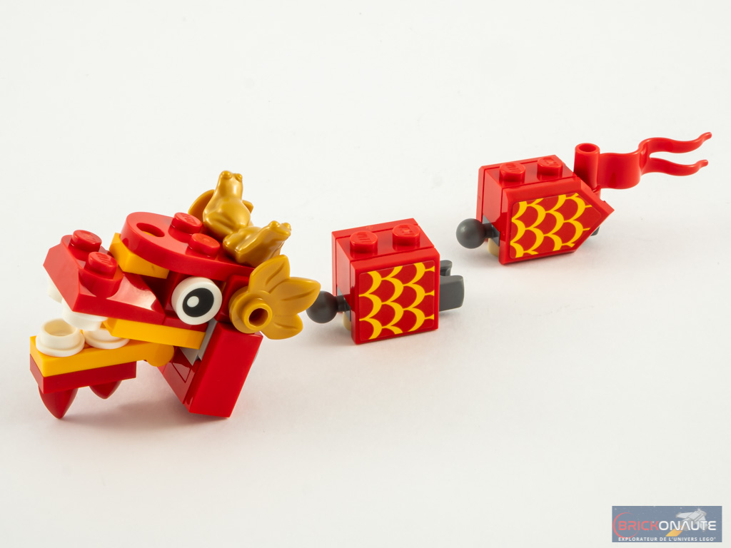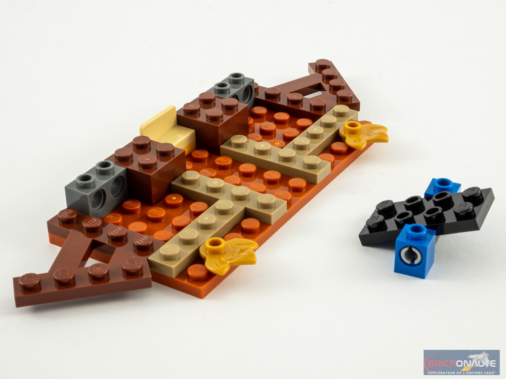 La construction commence par le dragon manipulé par Kevin sur l’illustration de la boîte. Il est composé de 3 éléments articulés entre eux par des ball joints – on regrettera malheureusement la couleur grise de ceux-ci. La construction de la tête est très intéressante. Remarquez ici l’utilisation des feuilles et grenouilles dorées. Les 4 autocollants présents dans le set servent ici, pour représenter les écailles du dragon.