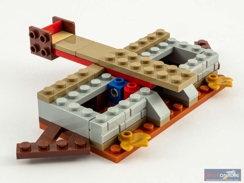 On attaque alors l’élément principal du set. Il est basé sur une plate de 6×12 tenons. Au centre, un dispositif articulé sur des pins Technic constitue la base de la catapulte, l’élément principal de la jouabilité de ce set. On prolonge d’ailleurs celle-ci des deux côté, pour constituer une « planche » de 12 tenons de long au bout duquel un espace est aménagé pour accueillir la minifig qui veut apprendre à voler. On termine cette étape en ajoutant une plateforme côté gauche qui comporte un râtelier d’armes.