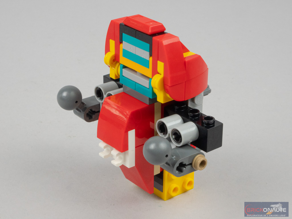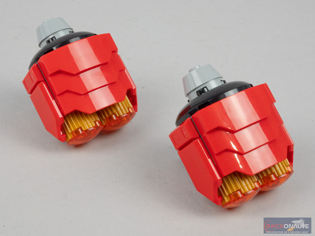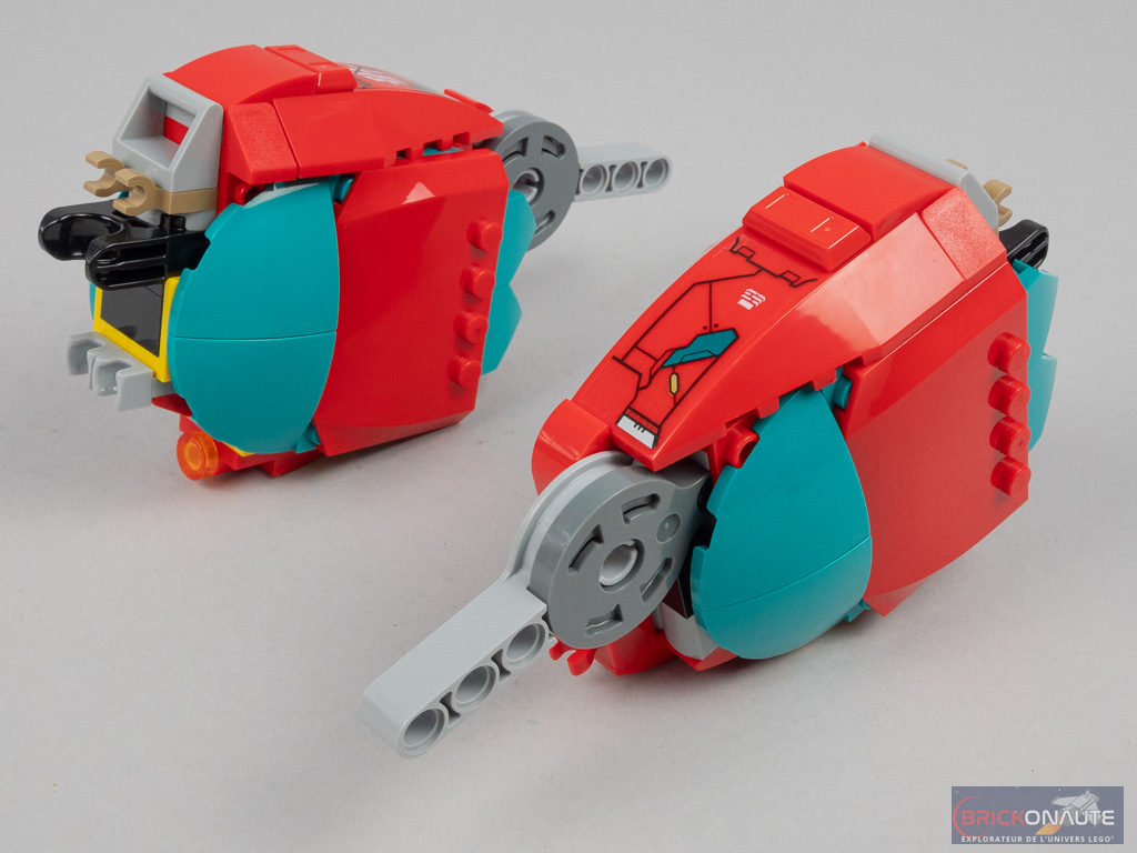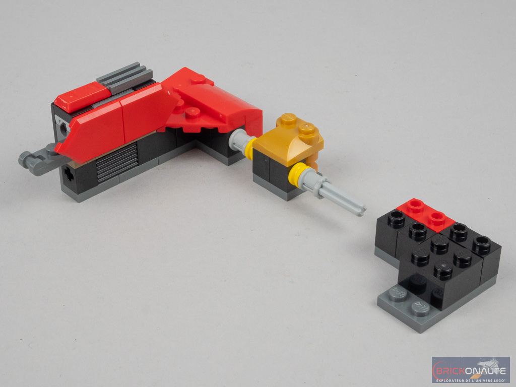 La construction commence par le petit ensemble « annexe » qui pourra par la suite être fixé au grand robot. Côté arrière, une petite structure à base d’éléments SNOT dispose de charnières en partie haute qui serviront à la fixation des canons, en formation robot. Une autre structure SNOT forme la partie basse et est décorée de grands éléments courbes. On assemble ces deux éléments, et on fixe la verrière rouge translucide sur des clips.