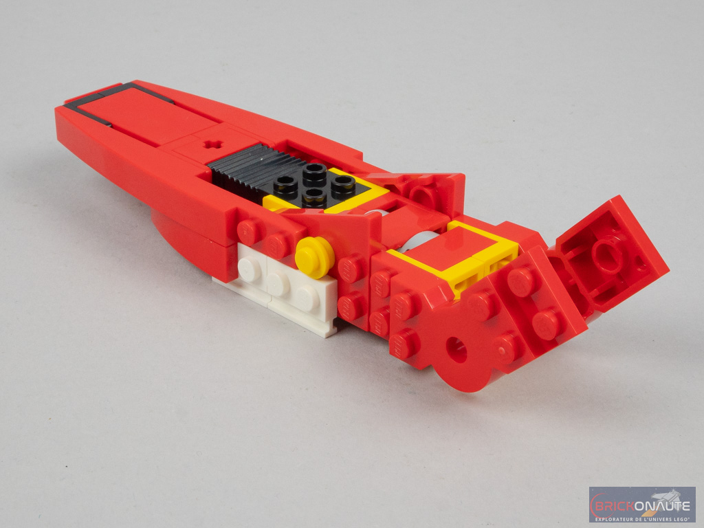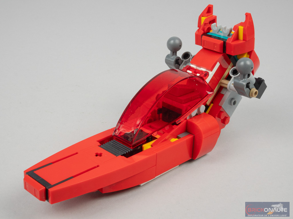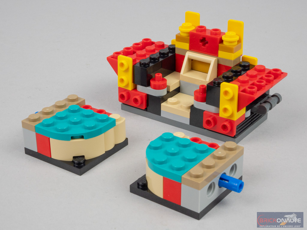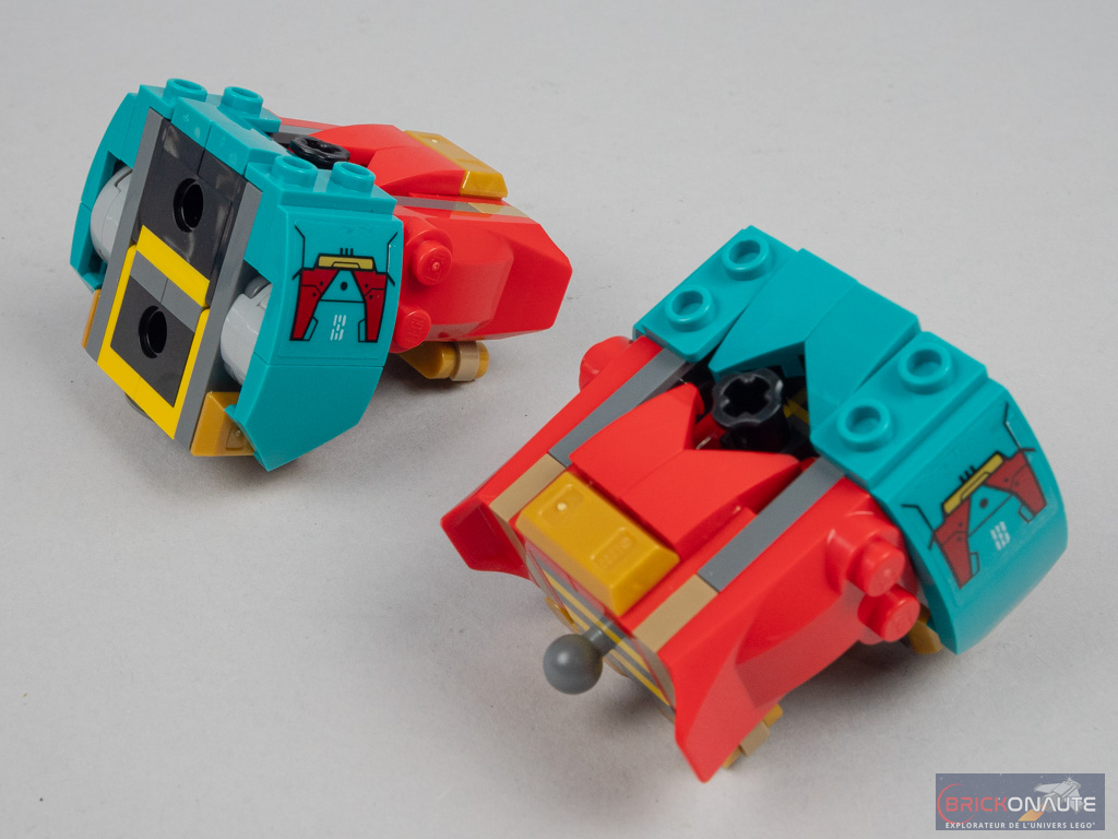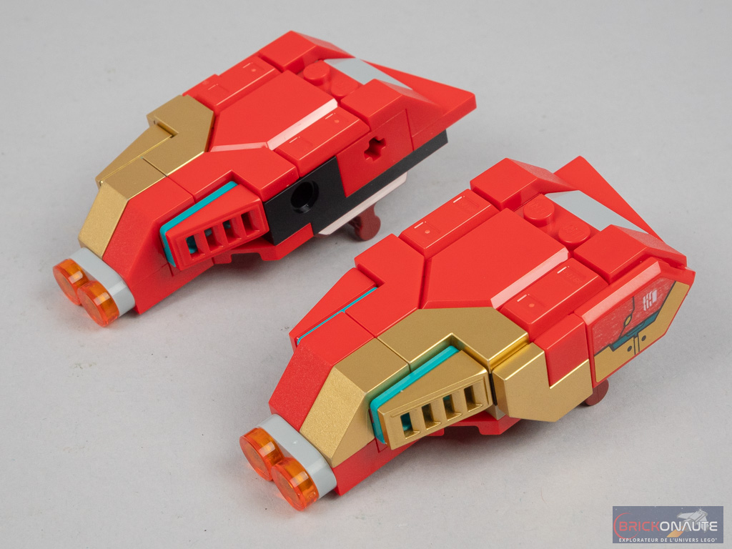 La construction commence par le petit ensemble « annexe » qui pourra par la suite être fixé au grand robot. Côté arrière, une petite structure à base d’éléments SNOT dispose de charnières en partie haute qui serviront à la fixation des canons, en formation robot. Une autre structure SNOT forme la partie basse et est décorée de grands éléments courbes. On assemble ces deux éléments, et on fixe la verrière rouge translucide sur des clips.