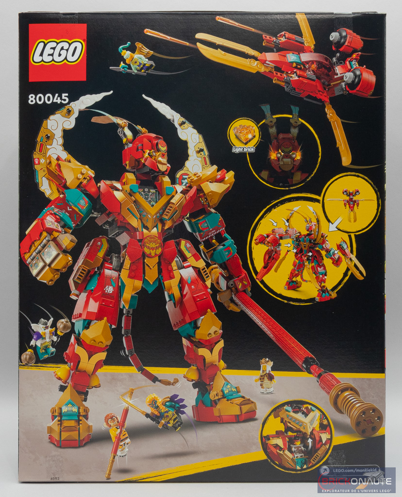 La boîte est plutôt imposante, logique pour un set de ce calibre. La face avant reprend les codes habituels de la gamme avec notre gros mech posé sur ses deux jambes, un énorme bâton sur l’épaule, au pied de l’escalier d’un temple dessiné en arrière-plan. Les différents personnages semblent combattre au pied de ce géant. Au dos, on le trouve dans une autre pose avec quelques vignettes présentant les principales fonctionnalités : une brique lumineuse, et un module détachable au dos du robot transformable en engin volant.