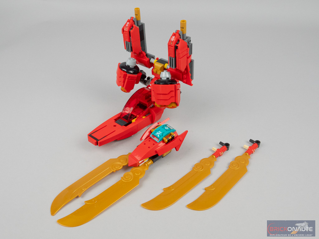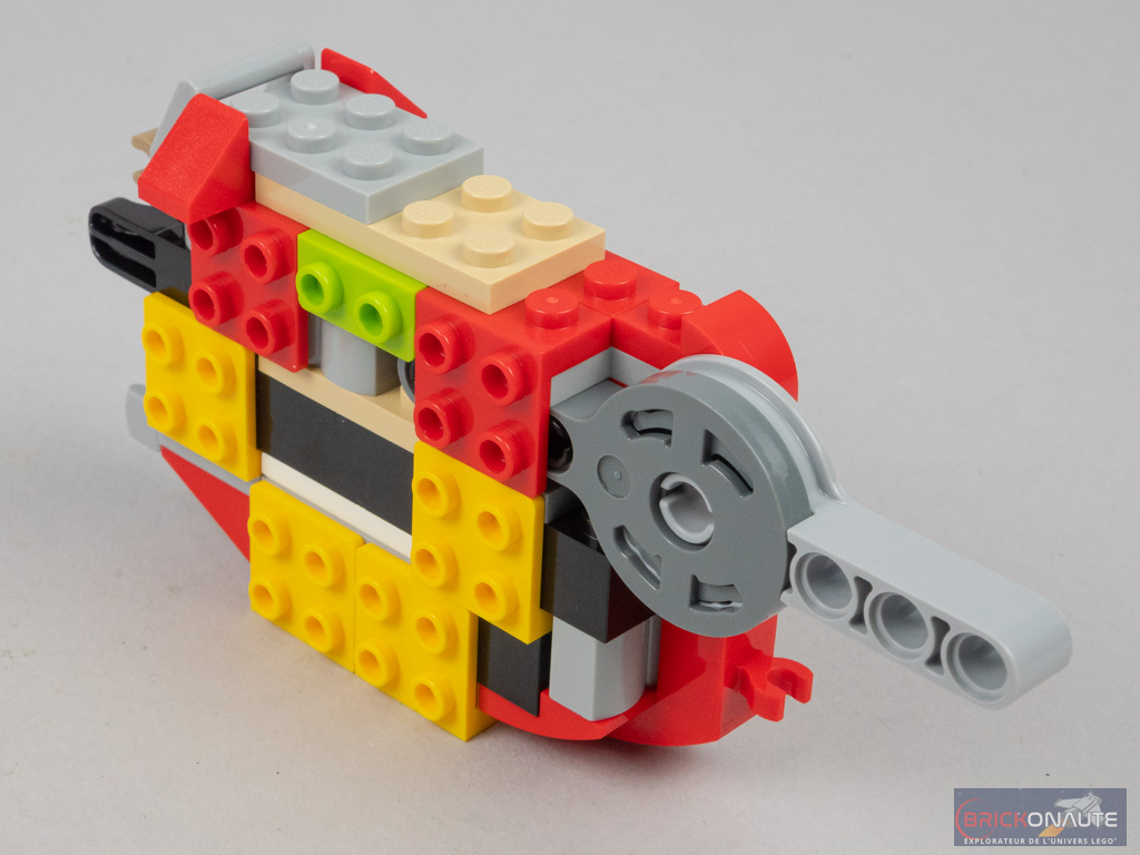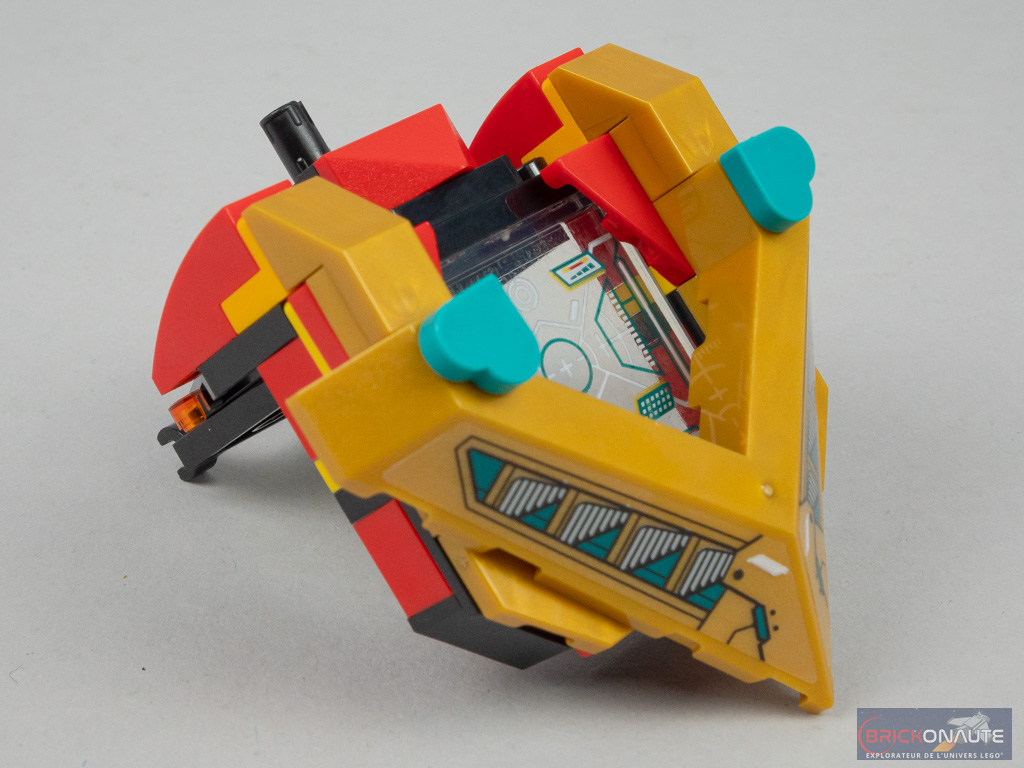 On continue avec un nouveau sous-ensemble qui va venir former le « nez » de la machine. Deux énormes lames dorées sont fixées à l’avant, sur des pins Technic. Deux autres lames identiques sont attachées sur les côtés, puis on assemble deux réacteurs qui viennent prendre place au niveau des ball joints à l’arrière. L’engin volant est alors terminé, on peut installer Monkie Kid aux commandes.