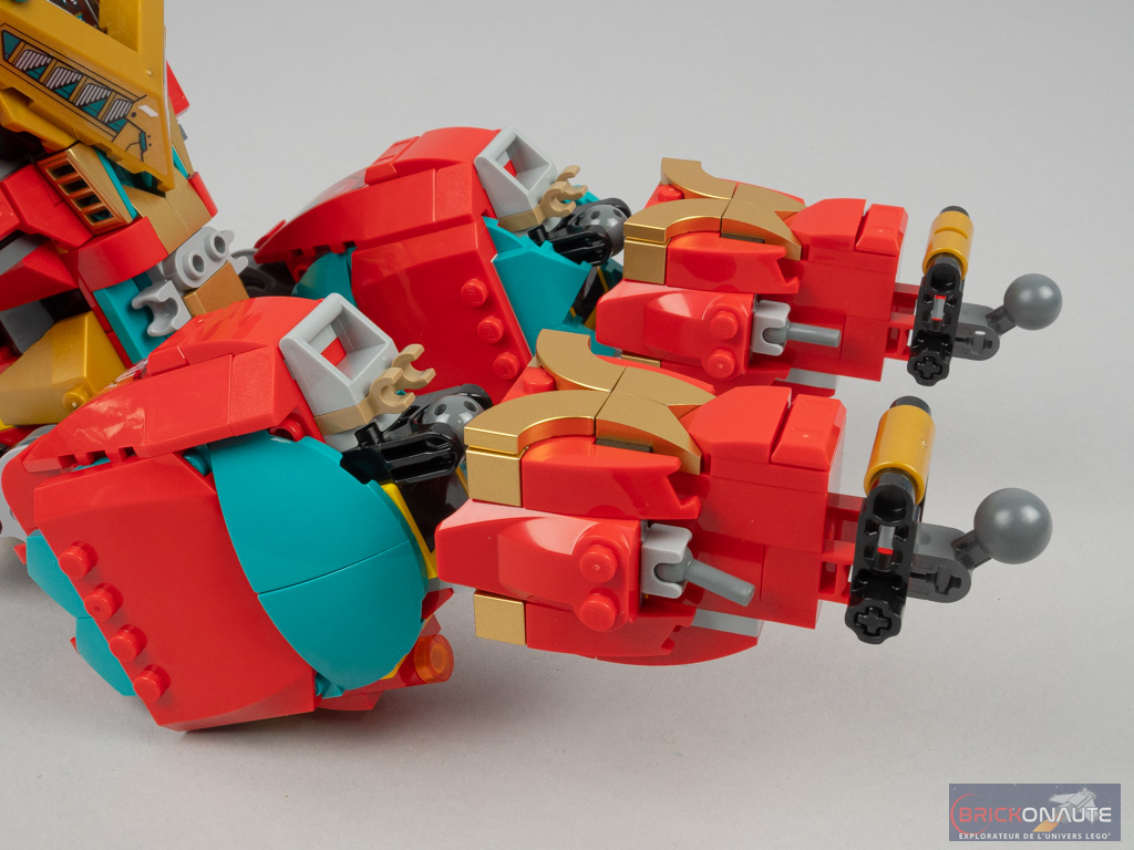 Le processus de construction est globalement très intéressant, avec un mélange d’éléments Technic, du SNOT et des assemblages plus « classiques ». Elle est logiquement décomposée en de nombreux sous-assemblages pour former les différentes parties du corps, et n’est jamais monotone. On regrettera seulement les autocollants, trop nombreux, qui ont l’avantage d’être transparents et d’éviter ainsi les écarts de teinte avec les pièces qu’ils recouvrent.