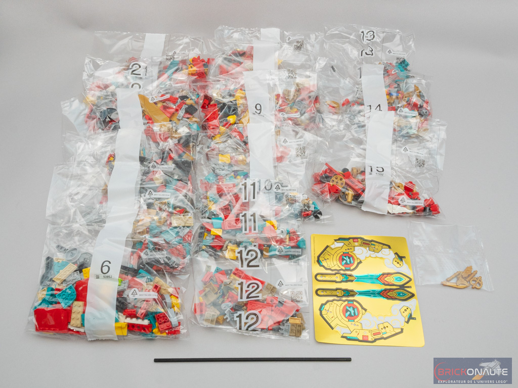 L’inventaire est particulièrement généreux avec 1705 pièces pour 139,99 €. Et pour ne rien gâcher, il est également très varié avec pas moins de 348 éléments différents. On retrouve une jolie collection d’éléments dorés, avec 211 pièces en pearl gold ou metallic gold. Le cousin LEGO Monkie Kid 80012 Monkey King Warrior Mech, sorti en 2020, n’en contenait « que » 112, un record à l’époque.