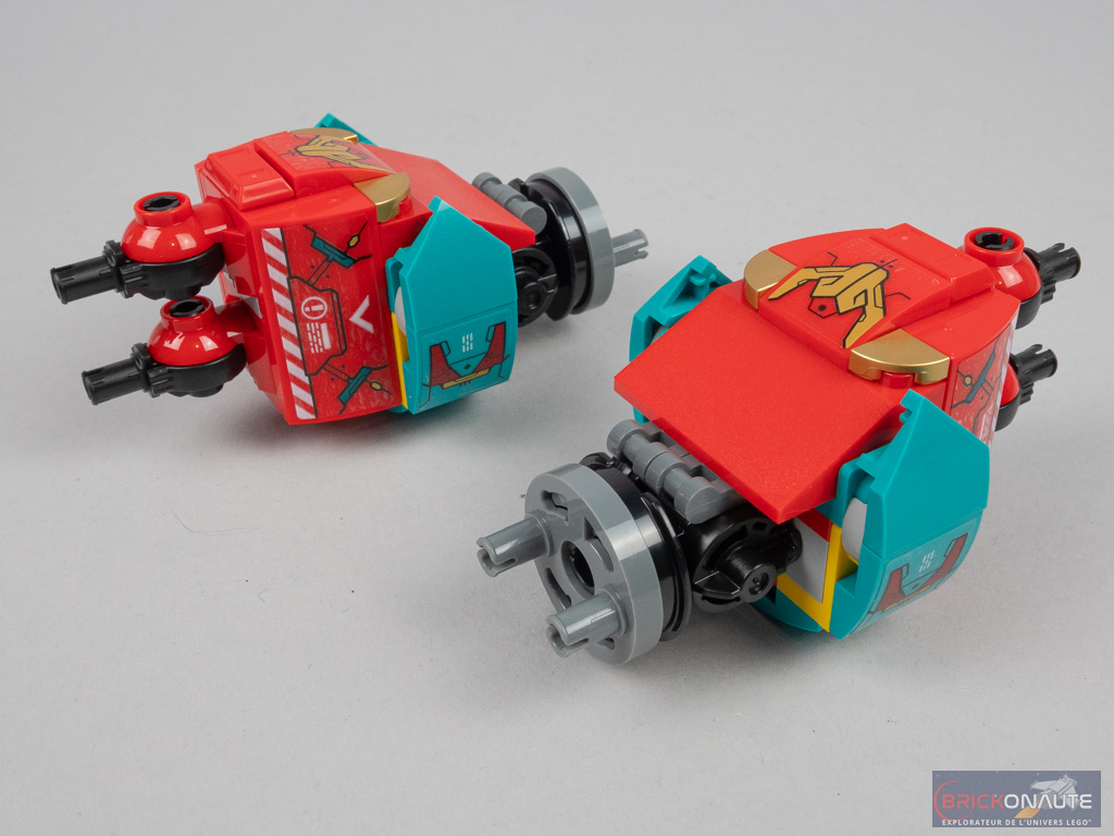Pour rester sur la jouabilité, on appréciera ici les nombreuses fonctionnalités : des spring shooters habilement dissimulés au niveau des épaules pour tirer sur tout ce qui bouge ; un cockpit à ouvrir pour y placer Monkie Kid aux commandes ; la possibilité d’attacher / détacher l’engin volant pour donner au robot une toute autre stature – sans oublier les nombreuses articulations qui permettront de placer le robot dans (presque) toutes les positions. Seul petit regret ici : il n’est pas rare, en voulant mettre le robot dans une nouvelle position, de voir se détacher certains éléments décoratifs. Et la brique lumineuse intégrée dans la tête est finalement assez anecdotique.
