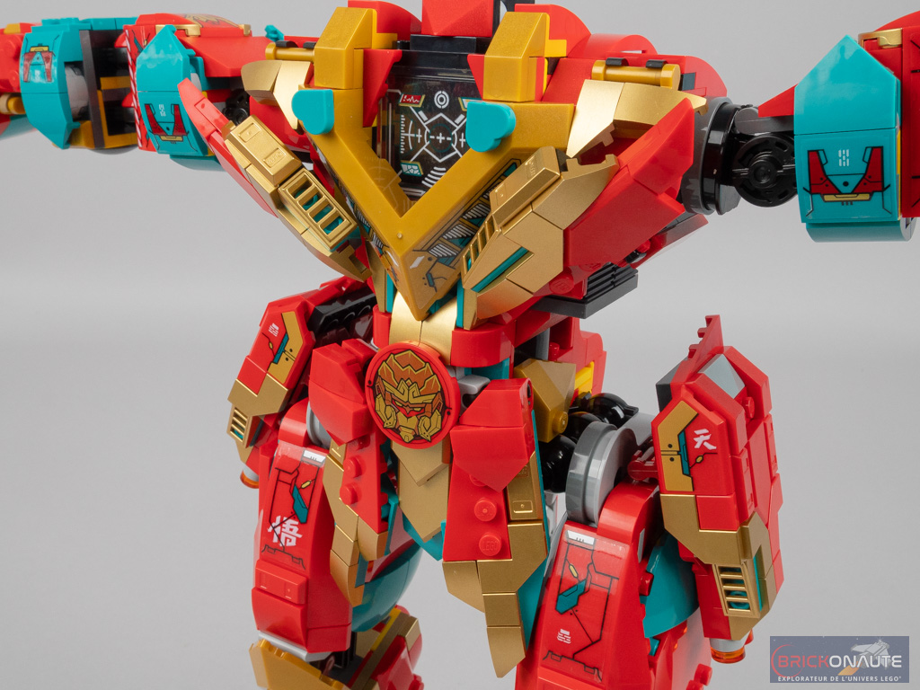 Les articulations sont plutôt robustes et le designer a choisi de ne pas en placer au niveau des genoux, sûrement pour des raisons de stabilité. Et elles sont globalement bien masquées par les différents éléments d’armure et, de ce fait, ne nuisent pas au design général de l’ensemble. Un design franchement réussi, faisant la part belle aux éléments rouges et dorés, des couleurs porte-bonheur en Chine. Le mélange est au final assez clinquant, mais ça fonctionne très bien malgré tout.