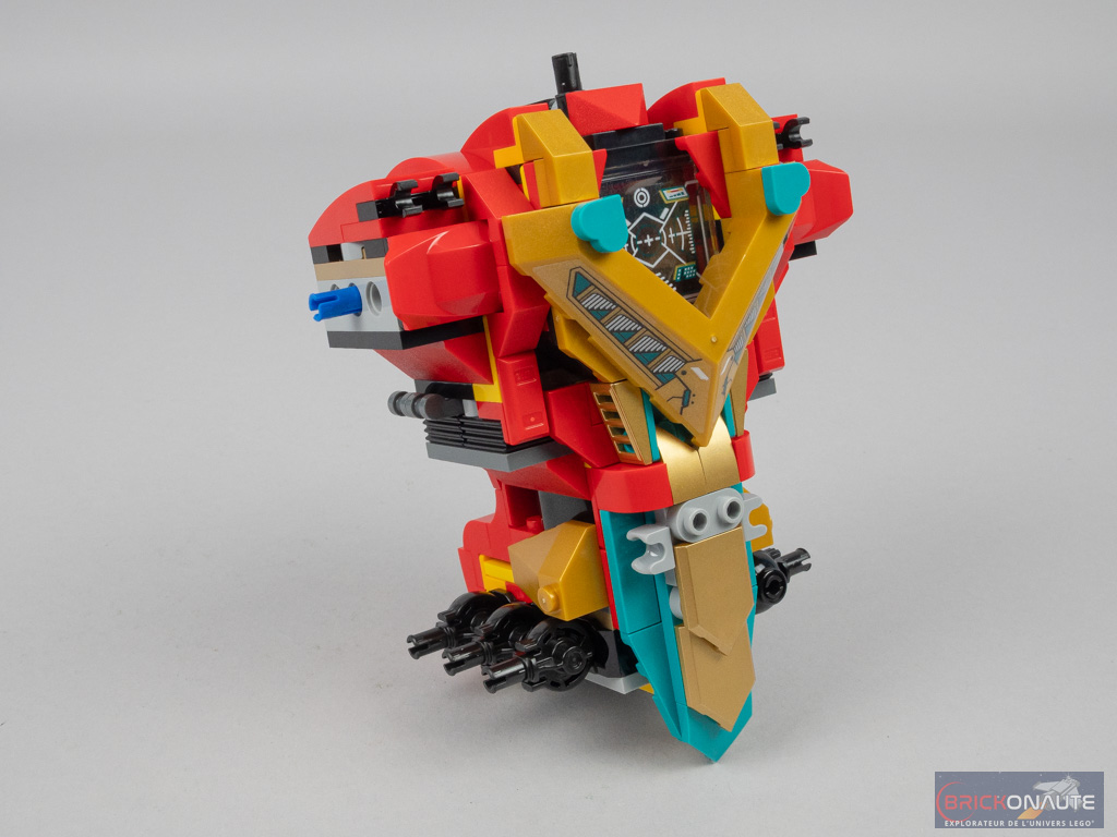Pour rester sur la jouabilité, on appréciera ici les nombreuses fonctionnalités : des spring shooters habilement dissimulés au niveau des épaules pour tirer sur tout ce qui bouge ; un cockpit à ouvrir pour y placer Monkie Kid aux commandes ; la possibilité d’attacher / détacher l’engin volant pour donner au robot une toute autre stature – sans oublier les nombreuses articulations qui permettront de placer le robot dans (presque) toutes les positions. Seul petit regret ici : il n’est pas rare, en voulant mettre le robot dans une nouvelle position, de voir se détacher certains éléments décoratifs. Et la brique lumineuse intégrée dans la tête est finalement assez anecdotique.