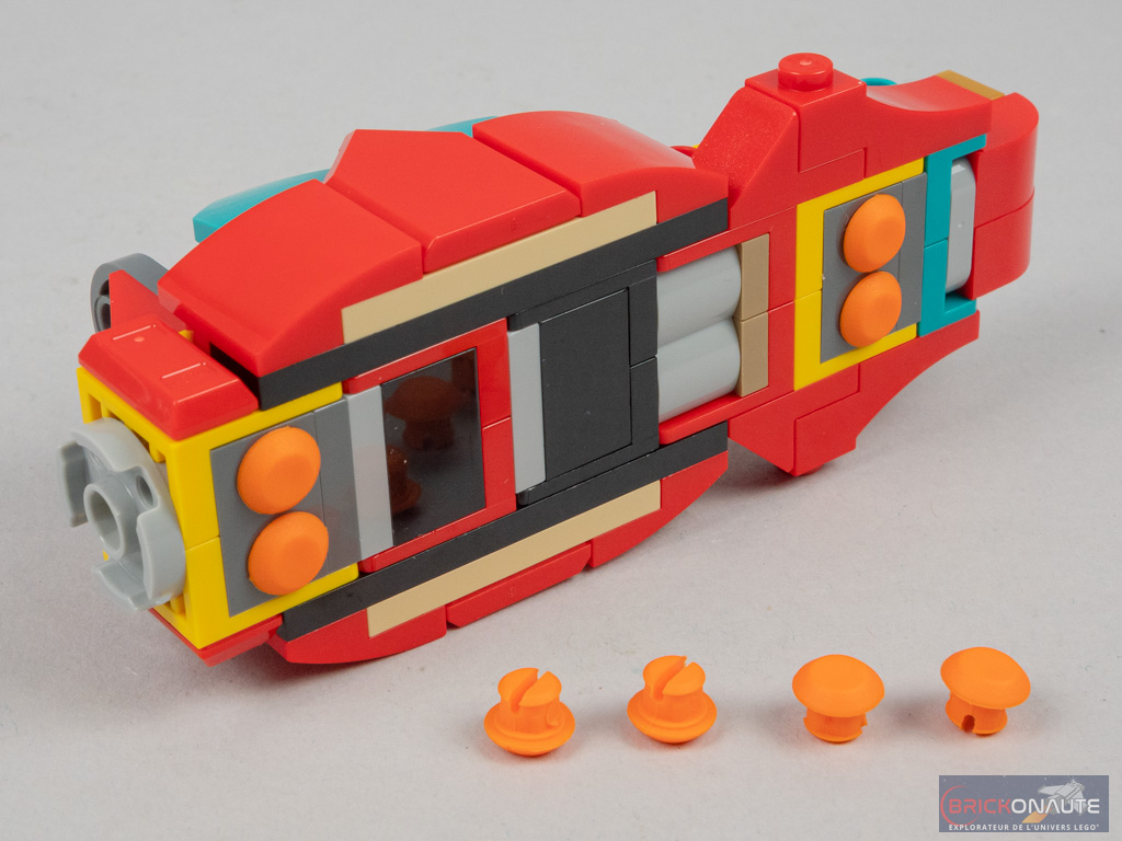 Le sachet de pièces suivant nous propose de finaliser le torse, avec la construction de plusieurs petits sous-ensembles qui viennent le décorer et donner un peu de volume à l’ensemble. On remarquera surtout ici la grande pièce ronde tampographiée placée au centre. On construit également la queue, un simple assemblage de petits éléments articulés entre eux par des ball joints.