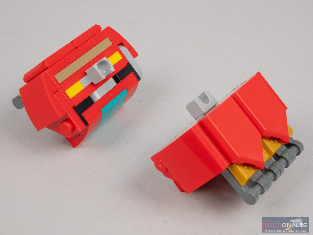 La construction commence par le petit ensemble « annexe » qui pourra par la suite être fixé au grand robot. Côté arrière, une petite structure à base d’éléments SNOT dispose de charnières en partie haute qui serviront à la fixation des canons, en formation robot. Une autre structure SNOT forme la partie basse et est décorée de grands éléments courbes. On assemble ces deux éléments, et on fixe la verrière rouge translucide sur des clips.